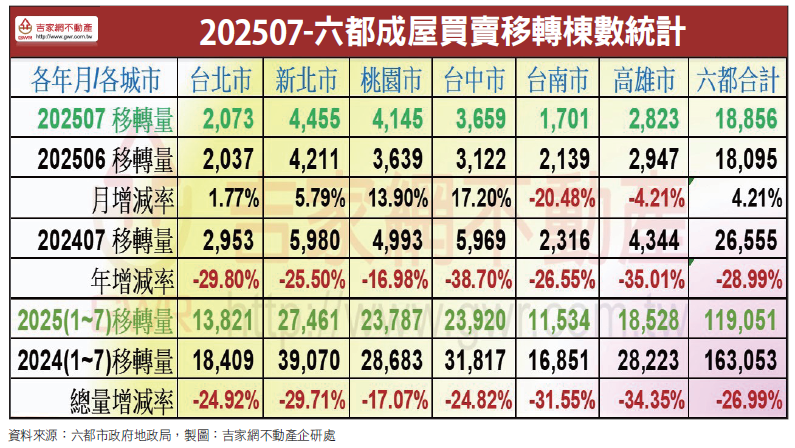今年1-7月六都房市成屋交易量持續萎縮,較去年同期減少26.99%,若未來五個月交易量不回溫,全年交易量恐低於28萬棟,極可能創下十年來次低量,首善之區台北市年交易量約在2萬6千至2萬8千棟之間,與十年前相比,幾乎是腰斬再打折,主要問題在於換屋市場全面被閹割,這種不正常的發展現象,完全歸咎於政策化療式打房的後遺症,使得市場交易受扭曲,產業發展受到傷害。