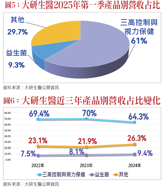 三高控制及視力保健一直是公司近年來主力產品,2022年營收占比69.4%,2023年成長到70%,2024年64.3%(如圖六),2025年第一季維持在61%。