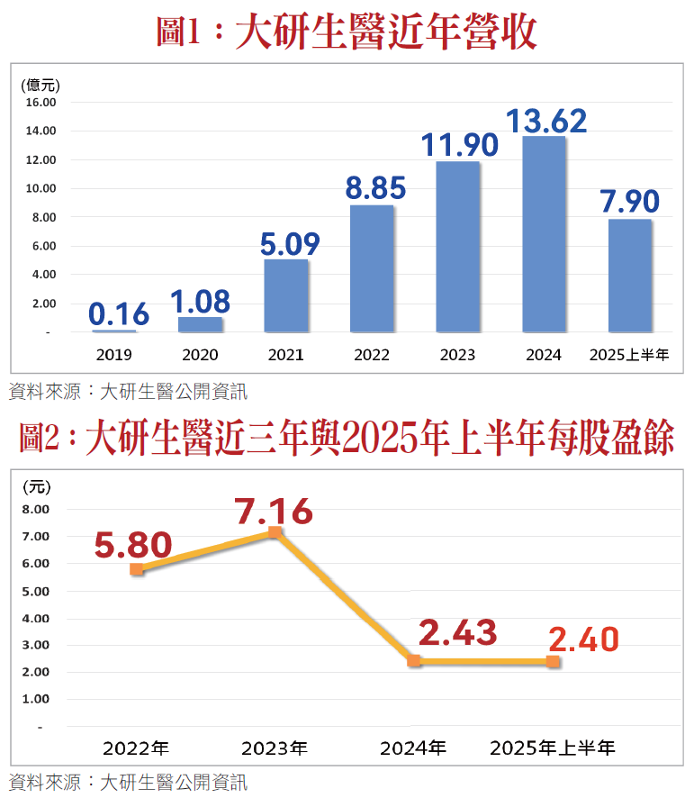 近三年每股盈餘分別為5.8元、7.16元、2.43元,2025年上半年已達2.4元(如圖二),與2024年全年2.43元相近。2024年每股盈餘減緩係受到小林紅麴事件影響,第一季虧損3100萬元,退貨負債7600萬元,存貨報廢損失2562萬元,第二季雖恢復獲利,全年每股盈餘下降為2.43元。