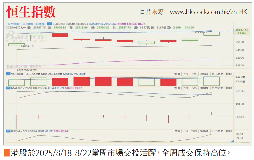 上周(2025年8月18日至8月22日)香港股市呈現先抑後揚走勢,三大指數在周初承壓後逐步回升。恒生指數8月18日開盤25293.34點,當日下跌0.37%報收25176.85點,隨後幾個交易日市場情緒逐步回暖,至8月22日收盤報25339.14點,全周累計上漲0.27%。恒生科技指數表現尤為突出,8月22日單日大漲2.71%至5647.68點,全周累計上漲1.89%。恒生國企指數收報9079.93點,全周累計上漲0.45%。市場交投活躍,全周成交保持高位,8月18日成交金額達3127億港元,8月22日單日成交2855.84億港元,整體市場流動性充裕。