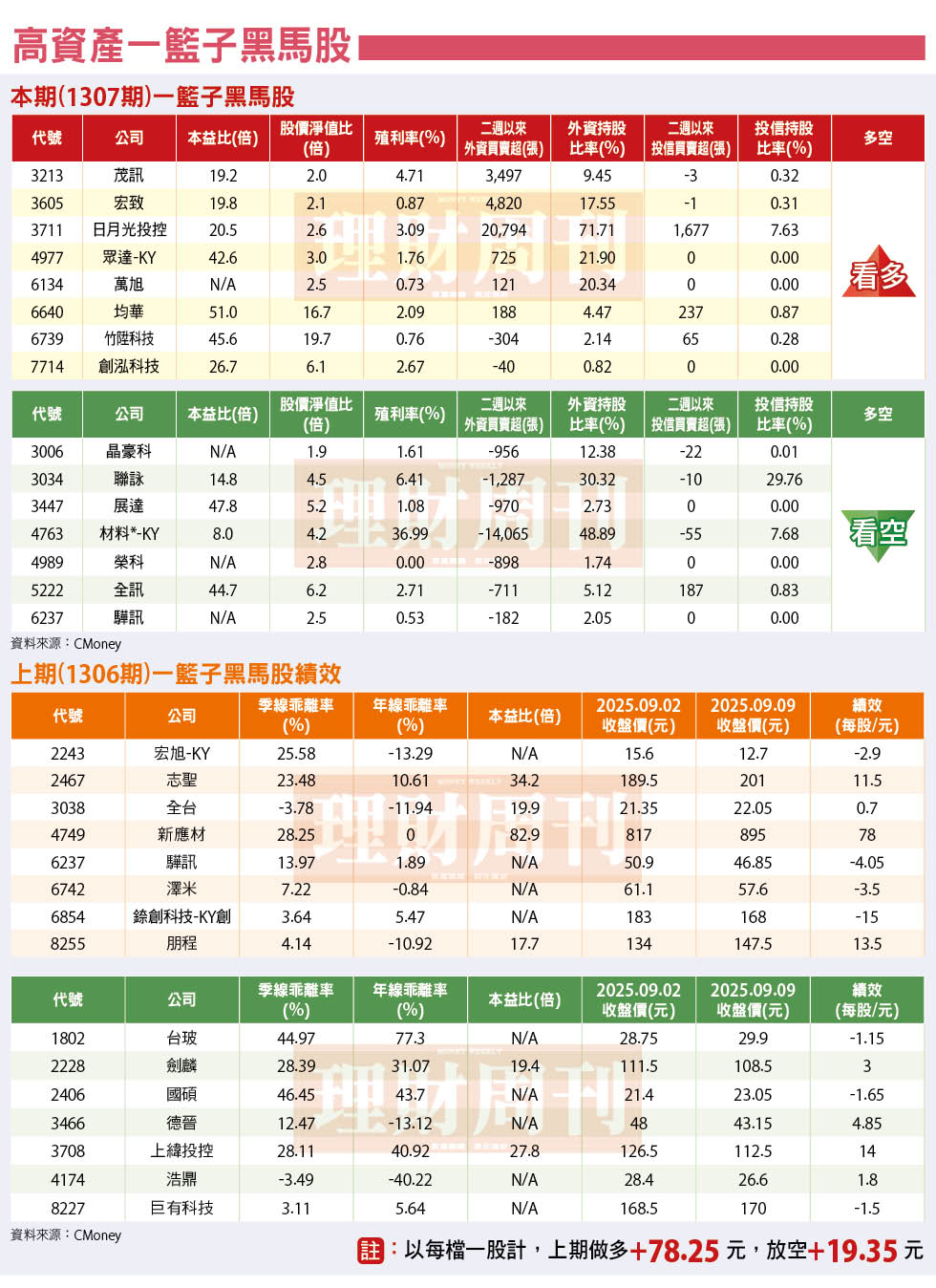 一籃子黑馬股多空掩護操作,多方倉順勢操作賺多虧少,新應材(4749)續賺78元,多方倉整體賺78.25元。空方倉逆勢操作得宜,上緯投控(3708)賺14元,空方倉整體賺19.35元。多空總績效共賺97.6元。