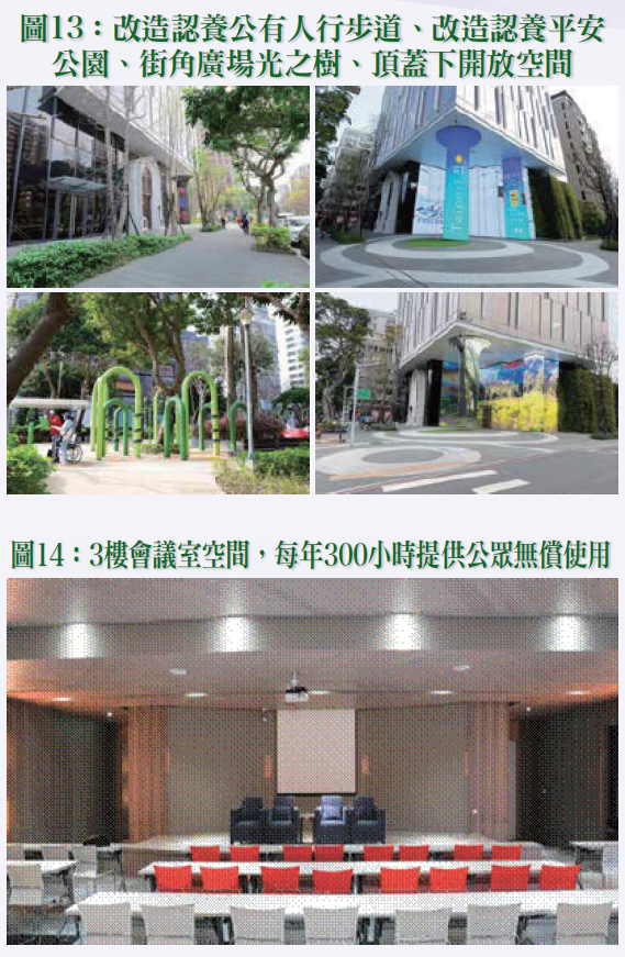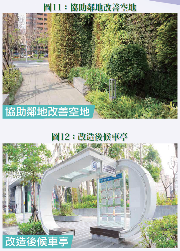 3.本案以「再造敦化綠大道新風貌」為願景,導入綠建築與智慧科技,改造平安公園,打造童趣森林主題公園,並改建公車候車亭,捐贈YouBike 20柱,並認養公有人行道,此外,3樓會議室空間每年提供300小時供民眾無償使用,以提升都市景觀與公共空間品質,並藉以展現公辦都更極為重要之公益特性。