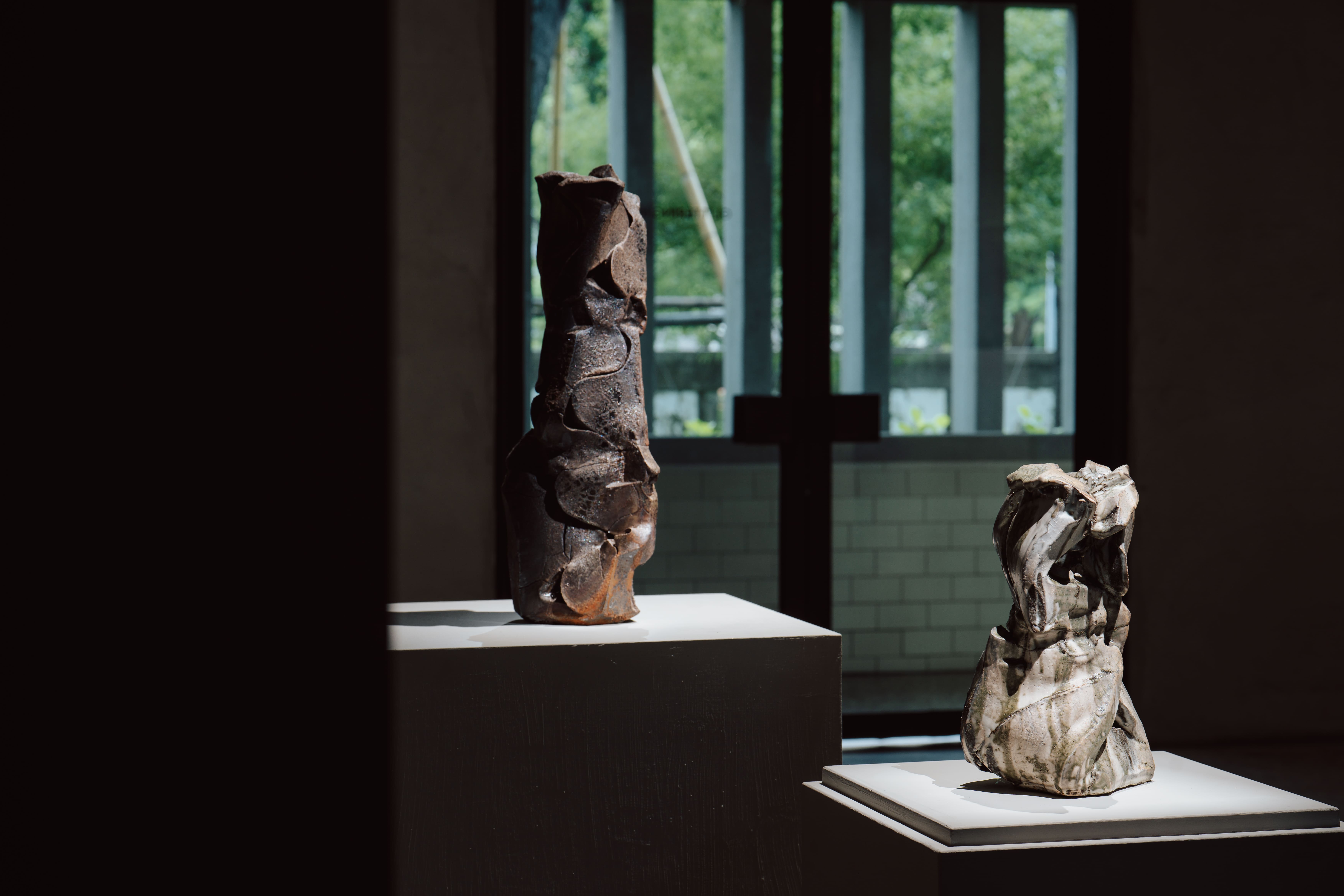 與藤村真的畫作相互映照的,是陶藝雕塑家道川省三(Shozo Michikawa)的陶土雕塑,為空間創造出動態起伏的地景,一場無聲的對話,在塵與金、光與土、裂與光澤間,悄然展開。