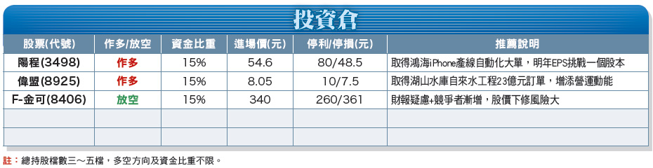 高志銘理周投顧研究部主管 ●學歷:銘傳財務金融所 ●證照:證券投資分析人員(CSIA)合格 ●專長:電子產業趨勢及籌碼分析、PC、手機及網通產業研究、尋找中小型潛力黑馬股。生產自動化設備廠陽程(3498),提供產業自動化科技解決方案,從單機設備到系統整合、客製化整廠規劃設備,全自動無人化CNC加工廠系統整合、全自動組裝、成品加工生產線,約有八成營收來自產線自動化相關貢獻。九月順利打敗鴻海(2317)子公司京鼎(3413)及富士康旗下鴻超準產品事業群(SHZBG),取得鴻海的iPhone生產流水線自動化工程大單,十月已開始放量出貨,預估此訂單金額將超過五十億元,加上認列陽程光電虧損影響將大幅降低,預估明年EPS將可挑戰一個股本。偉盟(8925)則與瑞鋒營造共同投標取得「湖山水庫下游自來水工程」標案,決標金額新台幣二十三‧二二億元,成為推升未來營運成長的重要動能,增添營運虧轉盈的機會,此利多同時激勵股價上演底部翻揚的反彈秀。由於目前股價仍低於每股淨值的十.○一元,在攻擊力道轉強帶動下,近期有望逐步往淨值來靠攏。放空財報有疑慮的F-金可(8406),第三季單季營收一五‧五二億元中居然有六‧五三億元是應收帳款,且應收帳款從二○一三年第一季的二七‧八九億元,一路增加到今年第三季的五一‧四億元,應收帳款週轉率更僅有○‧三二,顯示收款能力相當差,加上第三季現金流量表因新增借款約二十一億元,才讓當期現金流量維持正數,不免增添市場對未來營運風險大增的疑慮。