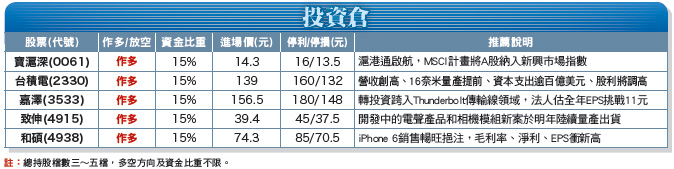 國際股市再創新高,美國道瓊指數早就已經脫離二○○七年的高點兩成以上,近期拉回後又再創新高,加上美元指數持續走強,都在反映美國持續偏多的態度。統計一九九四年以來的縣市長選舉,選後一到二個月的表現並不差。根據JP摩根統計,過去十年台股各種大小選後三十個交易日平均上漲幅度四%。目前月KD指標往下,周KD往上,日KD也往上,從整體趨勢來看,屬於中期反彈格局,依照底部型態推估,小底的滿足點九千一百已到,但大底滿足點預估在九七四○。融資在十月九日開始大幅減少,外資在十月二十七日開始買進,顯示台股籌碼已經趨向穩定。目前三線糾結,未來月線持續上揚,季線下降,年線緩步墊高,三均線糾結過後等多方表態,年底有機會再走一波多頭行情。寶滬深(0061):大陸國家主席習近平上任後,積極多面向改革,使陸股熱度持續回溫。滬港通已經啟航,MSCI計畫將A股納入新興市場指數,預期將帶進人民幣一兆元的錢潮。四中訂下法治根基,中國大投資時代來臨。嘉澤(3533):連接器廠布局伺服器市場成果逐漸顯現,預計第四季伺服器占營收比重可望達二成。轉投資的嘉基已順利跨入Thunderbolt傳輸線,及伺服器用的SFP及QSFP連接線領域。累計前三季每股盈餘八.三元,法人評估全年EPS將可挑戰十一元。和碩(4938):在蘋果智慧手機iPhone 6銷售暢旺挹注之下,毛利率、淨利、每股稅後盈餘衝上新高。美系外資認為股價遭低估,且明年資本支出擴大,明年營收有潛在的成長動能,因此給予加碼評等,並提高目標價。