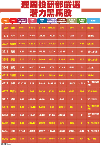 理周投研部嚴選佳格、裕日車、同致、樂陞、江興鍛、和碩、華星光、聰泰、雷科、台郡、宏捷科等高成長、淡季不淡長線績優股。台北股市喜迎新春開紅盤,市場氣氛急轉熱絡,大盤反映歐美股市強漲創高利多,指數喜創七年來新高點位!根據國際機構所做預測數據指出,二○一五年全球經濟成長率可望較二○一四年提高○.五~○.六個百分點。根據台經院公布最新預測報告指出,二○一五年台灣實質GDP成長率將為三.四八%,較去年表現好的結果,將有利台股今年後市表現。本周投研部選股邏輯與挑股方向,主要為協助讀者選擇今年有望持續受惠,產業長線基本面利多加持效應、具中長線營收獲利成長動能個股,以利進行後續布局操盤。因此,將選股重心放在為大家預先篩選出,後市財報面表現成績可望繳出亮眼成績單;同時,市場法人、主力也早已鎖定,也想趁著股價還沒有反映利多題材大漲之前,搶先布局、買進的漲升潛力股。預料它們接下來的股價表現,仍有機會在市場強勢買力推升下走揚上漲,順利上演農曆年開紅盤後亮麗行情。財報數字亮眼 法人優先布局的11檔潛力股透過最新公布財報數字分析、獲利能力強弱研判、法人鎖定加碼力道強度分析、市場籌碼歸屬方向釐清等重要選股程序,層層篩選、精挑細選出市場法人資金青睞、鎖定按讚的潛力漲升股,主要可粗分為:電子、傳產類股;再細分出次產業族群分類,歸類為:半導體、其他電子、通信網路、資訊服務、電子零組件、電腦及週邊設備、食品、電機機械、汽車、文創等次產業族群股。本周理周投研部所精選出標的個股中,財報數字表現優異,有利市場法人趁勢撿拾,領先布局以及買回的標的股有:佳格(1227)、裕日車(2227)、同致(3552)、樂陞(3662)、江興鍛(4528)、和碩(4938)、華星光(4979)、聰泰(5474)、雷科(6207)、台郡(6269)、宏捷科(8086)等。市場籌碼歸屬方向分析方面,在我們所選出標的個股之中,市場外資及投信法人近期較為看好,鎖定與買超力道較強勁、加碼態度較積極的標的股有:和碩、雷科、台郡等。和碩、雷科、台郡 法人默默搶貨Apple供應鏈和碩(4938):和碩去(二○一四)年強勢打入蘋果供應鏈,成功搶下iPhone 6部份組裝訂單,因而順利推升去年全年營收,強勢大增突破兆元新台幣關卡,預估年度獲利很有機會順勢創高,繳出亮眼成績單!市場人士目前大多預期,和碩今年將挾著去年的「搶親」蘋果iPhone 6部份組裝訂單旺盛氣勢,很有機會繼續包下超過一半以上的四.七吋iPhone 6S代工訂單,持續增添後市營運獲利動能。二月營收因受工作天數減少影響可能減少,三月份將可望維持一月千億元水準,外資機構看好和碩第一季營收有機會挑戰二八○○億元歷史次高水準。雷科(6207):被動元件設備廠,今年一月營收一.九八億元,年增率七○.三九%,表現亮眼。去年由於受惠晶片電阻廠擴增產能,以及老舊生產設備汰換潮產業利多,使得公司自第三季起即見到出貨明顯增溫,營運大幅轉佳有如倒吃甘蔗,第三季EPS繳出○.六四元佳績後,第四季更在訂單遞延效應加持下,營收更上層樓成長達六.六二億元,成功創下十三季新高,市場法人預估雷科單季EPS極有機會站上一元,全年可達二.二元水準,為過去三年以來最佳表現。預料後市營運表現,有機會於雷射切割機、散熱基板鑽孔機出貨需求力挺下,見到淡季不淡榮景。台郡(6269):台灣軟式印刷電路板大廠,今年一月合併營收一七.四二億元,年增率六○.五七%,表現大好。由於營運轉型見到明顯改善效應,順利推升台郡不僅去年第四季獲利喜創歷年單季新高,今年一月營收實績同樣成功改寫公司歷年同期新高水準。台郡於法說會上表示,展望今年營運後市,除第一季產能可順利增加三~四成外,後續每一季度表現也將有很大機會比去年同期好,公司可望歡喜迎來接下來三~五年成長高峰。