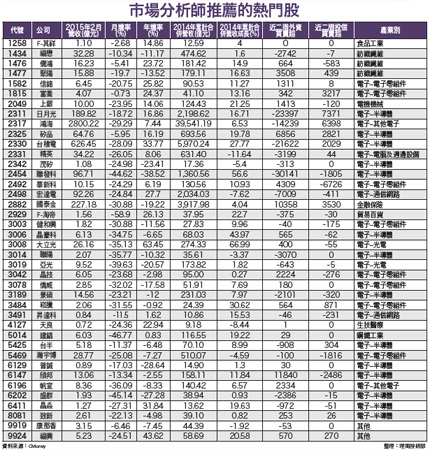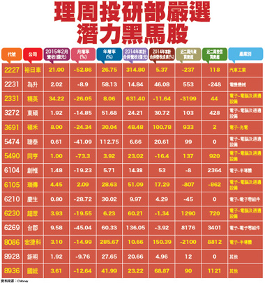 「大數據鏢股」推出以來,九檔個股波段漲幅逾二成,宏捷科更飆漲逾五成。綜觀後市,中小型股仍有機會冒出頭,盯緊本欄「好球帶」,抓好節奏迎接「紅不讓」。「大數據鏢股」自七五二期以來,向各位讀者推薦的嚴選標的股中,截至目前為止,已有九檔個股的波段漲幅皆漲升達二成以上,其中,宏捷科(8086)累計波段漲幅更高達五○.四五%!對比大盤指數、櫃買指數、臺灣五○等盤面觀察指標,其同期間漲幅表現,分別為三.七五%、八.七八%、四.四二%,相形之下大數據鏢股的精彩漲勢,相信讀者都有目共賭!無畏系統性風險衝擊 中小型股仍有機會冒出頭台北股市近期走勢表現,明顯受到外資買盤影響,加上歐美股市政治與經濟面雜音頻傳,導致市場最大買盤進場推升指數意願明顯轉低,隨著盤面多檔權值股走勢相繼轉弱,大盤指數也跟著呈現高檔盤整型態,市場控盤者頗有要以盤待變的意味。儘管集中市場未見強勢亮眼族群,但櫃買市場的中小型個股卻是迭有佳作,短線此起彼落。出乎意外的亮眼表現,令人驚豔,成為近期台股盤面最為吸晴的焦點。本周投研部選股邏輯與挑股方向,為符合台股目前持續中多格局,操作標的以中小型個股為主,因此將挑股重心,放在為讀者預先篩選出財報面表現佳,同時具市場利多題材性,且為法人、主力多所青睞,早已鎖定搶先布局,具籌碼面優勢之標的,以期能夠掌握機先,協助讀者投資獲利。我們透過最新公布財報數字分析、獲利能力強弱研判、法人鎖定加碼力道強度分析、市場籌碼歸屬方向釐清等重要選股程序,精選市場法人鎖定的潛力漲升股,主要可粗分為電子、傳產類股,再細分出次產業族群,包括:半導體、光電、電子零組件、電腦及週邊設備、電機機械、汽車等。本周理周投研部所精選出標的個股中,財報數字表現優異、有利市場法人趁勢撿拾、領先布局及買回的標的股有:裕日車(2227)、為升(2231)、東碩(3272)、碩禾(3691)、聰泰(5474)、瑞傳(6105)、慶生(6210)、台郡(6269)、宏捷科(8086)、鉅明(8928)、國統(8936)等。市場籌碼歸屬方向分析方面,在我們所選出標的個股之中,市場外資及投信法人近期較為看好,鎖定與買超力道較強勁、加碼態度較積極的個股有:東碩、碩禾、國統。東碩、碩禾、國統 法人背書、基本面優 漲勢可期東碩(3272):去年度營收三一.五七億元,稅後純益年增率高達一八二%,EPS為一一.九六元,居台股連接器族群股之冠。由於東碩具Type-C應用概念,加上預計配發八.五元股利,激勵股價近期連續漲升。在USB接頭新舊規格輪替之際,造就轉接器需求量大增,新款Macbook連接端口更只剩一個Type C,尤其需要外連轉接器、擴充機座。東碩指出,近期客戶詢問度大幅增加, Type C擴充基座市場商機,已自第三季提前至第二季開始發酵。碩禾(3691):太陽能族群股王,主力產品為導電漿,去年鋁漿、正銀出貨量增幅亮眼,營收、獲利同創歷史新高。去年合併營收年增率達一倍,稅後淨利年增一.四一倍,同樣創下歷史新高,EPS達二四.五四元。董事會決議每股配發一五元現金股息,現金殖利率約三%左右。展望本季後市表現,二月合併營收雖為近六個月新低水準,但年增率達三成,同時未來國際銀價有撐,預估碩禾本季營收仍可望較去年第四季成長,續創歷史新高。國統(8936):國統所轉投資的中國「福建台明鑄管」(持股比例五一%),主要營業項目為球墨鑄鐵管(DIP)生產與銷售。根據中國鑄造協會報告指出,預估今年DIP市場需求將大幅增加至五百萬噸,在福建台明鑄管未來產能全開後,將可達三十萬噸年產能,預料將可大幅解除市場供給不足窘迫市況。如以每噸售價二萬元新台幣計算,福建台明鑄管將可貢獻國統營收多達六十億元台幣。理周投研部評估,國統今年營收有望大褔成長五○%,營收將增達五八.八二億元,全年EPS可望五.五元以上。分析師買進個股五花八門 財報面不佳、法人背棄者 後市表現堪虞本周市場分析師所叫進標的股,仍以電子族群股為主,所屬次產業則散見於半導體、光電、通訊網路、電子通路、電子零組件、電腦及週邊設備等族群。至於所叫進非電子類股方面,則大多落於食品、紡織纖維、電機、鋼鐵、金融保險、貿易百貨、生技醫療等族群,個股產業涵蓋範圍依舊過於複雜。在這些標的個股之中,從市場外資及投信法人近期買賣超動作加以分析,依舊有不少標的股是近期被外資、投信反手賣出者,如:福懋(1434)、日月光(2311)、台積電(2330)、聯發科(2454)、宏達電(2498)、聯陽(3014)、景碩(3189)、盛群(6202)等,可想而知,後市股價短線不易見到大漲走勢。從財報分析角度來看分析師所叫進個股,近期所公布財報數字表現較差的有:聚陽(1477)、茂矽(2342)、國泰金(2882)、健和興(3003)、亞光(3019)、僑威(3078)、景碩(3189)、普誠(6129)等,它們卻仍出現在市場分析師叫進名單上,無法通過財報面選股標準篩選,實在買不下手!