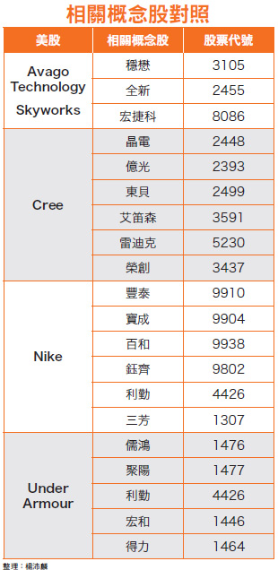 依此觀點自美股中挑選五檔符合標準,且與部分台股相關性較高者,整理如圖九,依序為安華高科技、艾睿照明、耐吉、思佳訊、安德瑪。在熱錢派對散場前,相關概念股若拉回即是好買點。理財小幫手1.各國央行調整利率時,媒體通常會以「碼」來表示調整幅度,其中,1碼代表0.25%。 2.債券市場中,常會看到「基點」這個名詞,例如上升20個基點。此處1個基點代表0.01%。