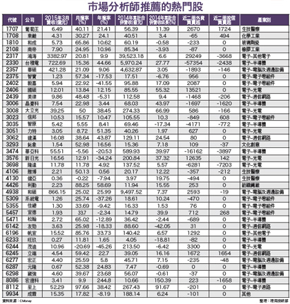 台股盤面仍以中小型股漲勢較佳儘管集中市場未見到漲勢兇猛、續航力強勁的族群股冒出頭,不過,櫃買市場裡中小型個股卻迭有佳作,輪流表態,走勢令人驚豔!本周理周投研部選股邏輯與挑股方向,有鑑於台股目前仍為中多格局不變,建議以中小型個股為主要投資標的,因此將挑股重心放在為讀者預先篩選出財報面表現佳,同時亦具市場利多題材,且法人、主力有所青睞並早就鎖定搶先布局,籌碼面具優勢之標的族群股,以期掌握先機,幫助讀者投資獲利。我們透過最新公布財報數字分析、獲利能力強弱研判、法人鎖定加碼力道強度分析、市場籌碼歸屬方向釐清等重要選股程序,層層篩選,精選出市場法人青睞的潛力漲升股。依此,主要可粗分為:電子、傳產類股,並再細分出次產業族群分類,主要包括:電子零組件、電腦及週邊設備、電機機械、化學工業、生技醫療、航運、貿易百貨等次產業族群股。本周理周投研部所精選出的個股中,財報數字表現優異、有利市場法人趁勢撿拾、領先布局的標的有:錩泰(1541)、華通(2313)、台光電(2383)、可成(2474)、萬海(2615)、達邁(3645)、聰泰(5474)、同亨(5490)、慶生(6210)、台郡(6269)等。至於市場籌碼歸屬方向,在我們所選出的個股中,外資及投信法人近期較為看好,鎖定與買超力道強勁、加碼態度較積極的則有:華通、萬海、聰泰等。華通、萬海、聰泰 財報公告佳 法人買超力挺 華通(2313):PCB產業高階HDI廠,去(二○一四)年每股稅後盈餘(EPS)為一.六七元,成功創下二○○一年以來獲利新高。三月營收三○.四八億,年增率二○.一%,一~三月合併營收達八六.七一億,年增率二○.五八%。華通除打入蘋果供應鏈外,也成功打進以小米為首的中國品牌手機供應鍵。華通為因應中高階HDI板市場需求持續增加,大幅增加今年資本支出至三○億元。外資券商最新出爐報告指出,看好華通產能擴增、產線效率大幅提升,營運獲利可望穩定增加,推估今年獲利年增率二三%,EPS可達二.○五元左右。萬海(2615):台灣貨櫃航商,自結三月營收五五.三三億,月增率三.一四%,年增率四.三六%,累計一~三月營收達一七一.五六億元,年增率一六.二八%。萬海因去年下半年新增多條亞洲區域內航線,今年首季應客戶要求調降運價,運價平均低於去年同期,但實際所獲油價減省利益高達十五億元,已超過運費降低損失。另一方面,萬海宣布開闢華南/越南/星馬航線(CVM),此航線可提供中國華南至越南、星馬,以及星馬至越南海防間快捷運輸服務,有利搭上東協消費市場快速成長的順風車。聰泰(5474):主力業務為數位電視模組產品,並於個人電腦應用領域研發與產銷。去年財報營收總額為八.三三億,毛利率三六.四五%,營益率一八.五四%,合併稅後盈餘一.四億元,年增率五五.三三%,EPS達四.一六元。日前公司董事會通過決議,每股擬分派現金股利三.五元。以近期的表現來看,聰泰三月營收一.二二億,月增率高達一○一.三三%,年增率亦高達二三○.七八%,累計一~三月營收總額二.八五億,年增率一○九.一%。財報不佳、法人賣超者 想漲也難本周市場分析師所叫進標的股,主要仍以電子族群股為主,所屬次產業則主要散見於半導體、光電、其他電子、通訊網路、電子零組件、電腦及週邊設備等族群。至於所叫進非電子類股方面,則大多落於橡膠工業、紡織纖維、化學工業、玻璃陶瓷、生技醫療、文化創意等族群股,個股產業涵蓋範圍有如霰彈打鳥,相當紛亂。在這些標的個股之中,從市場外資及投信法人近期買賣超動作加以分析,依舊有不少標的股,近期被外資、投信反向賣出,如華碩(2357)、美律(2439)、晶豪科(3006)、信邦(3023)、智原(3035)、華亞科(3474)、隆達(3698)、雃博(4106)、健亞(4130)、系統電(5309)、松翰(5471)等,可想而知,後市股價難出現亮眼漲勢。從財報分析來看分析師叫進個股,其中財報數字表現較差的有:智寶(2375)、毅嘉(2402)、華亞科(3474)、新日光(3576)、系統電(5309)、松翰(5471)、友勁(6142)、茂迪(6244)等,投資人要有警覺。