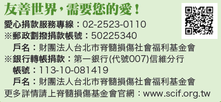 為鼓勵更多脊髓損傷傷友,從生活巨變中,重新燃起希望,追求夢想,脊髓損傷社會福利基金會建立「知」的平台,供受傷三年內,或未穩定、未進入適應期的脊髓傷友及家屬學習與交流相關知識、資訊、資源。讓傷友們不再因突遭變故身心巨創,而毫無知能因應;不再因身體傷殘而形成負向的自我概念,導致憂鬱、社會退縮。 本會舉辦《脊髓損傷資訊便利站》,一系列講座共十二場,主題包含:認識脊髓損傷、疼痛及舒緩密技、科技輔具等,盼望傷友們能儘早從最初受傷住院開始,就有系統地準備好進行出院的準備,透過實用知能的提升,減少錯誤的摸索,引導他們積極地生活重建,未來獲得更好的發展。讓脊髓傷友及家庭獲得適時適度的支持,減低SCI(脊髓損傷)衝擊帶來的生活失序與自我放棄,縮短震驚期、失落期的傷痛憂鬱,及早進入適應。小予是去年高雄氣爆的受害者之一,才二十二歲的年輕歲月,卻因一場災禍,目前為胸腰髓損傷的傷友,為了汲取更多知識,前來參加基金會舉辦的講座。脊髓損傷基金會以專業的社工介入輔導,將資源整合後協助告知傷友福利資源、行動輔具,並協助轉銜至桃園潛能脊髓發展中心生活重建課程,學習獨立洗澡、排泄,並協助改善其居家環境。本會從不同面向鼓勵傷友及家屬放下膽怯與不安,進而勇於參與、排除各項障礙,期盼脊髓傷友儘早回歸生活常軌,翻轉出不同的精彩人生。