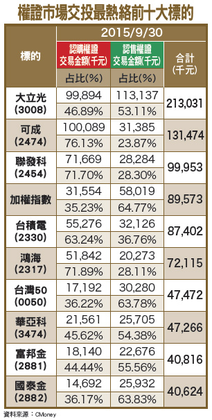 中秋連假期間國際股市修正壓力較大,台股季線也持續下壓並扣抵高點,反映在權證市場,可以明顯看到多數投資人抱持著指數稍有壓力的看法,加權指數和台灣50的認售權證成交都明顯大於認購權證。 iPhone 6S/6S Plus開賣首周超過一千三百萬支超乎市場預期,主因本次新納入中國市場為首賣地區,但反映出中國市場手機需求在上半年調整庫存後,第三季開始回穩,累積能量第四季將逐步釋放,對相關供應鏈為一大利多。央行九月二十四日公布降息半碼,影響最大可能是金融族群,存放款等利差將進一步縮小,金融股在認售權證變熱門,富邦金和國泰金兩大龍頭亦擠進九月三十日成交金額前十名。台股後勢雖面臨幾大變數,美聯準會年底前恐升息、市場擔憂中國經濟走弱、新興市場仍處動盪。但九月營收可望成長、第三季季報台幣貶值匯兌利多,美國企業財報財測Nike捎來佳音、i6S首購熱絡等利多支撐。中秋節後大盤開低走高,技術面仍守住八○五○多方缺口,季線下震盪後格局未明顯破壞。建議做好資金控管,持續留意個股基本面及技術關卡的變化,利用認購或認售權證槓桿操作。