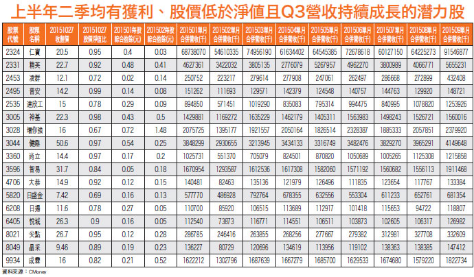 投資人居高思危,如果眼看反彈行情快速輪動,卻不敢進場,選股可留意第四季仍為傳統旺季,且股價具低本益比及低淨值比評價的標的。猶記得自去年底以來,中國股市便如同一頭囚禁已久的猛獸重獲自由,上證指數自去年十月底二二八○點起漲,一路不回頭的直奔今年六月的高點五一七八點,八個月來漲幅超過一二○%,也讓世人見識到中國在非高度自由且官方色彩濃厚的股市井噴的威力。但在中國經濟可能硬著陸的隱憂以及融資餘額大幅增加,市場已經明顯過熱的情況下,也讓上證指數硬生生的自高點拉回,短短二個半月便回測了將近四五%的幅度,更讓先前看到股市大好,而一窩蜂跳進股市的中國投資人遍體鱗傷。陸股反彈波段滿足點應為四千點在經過一個半月的休養生息之後,中國股市開始出現止跌回升的走勢。由於自八月股災以來,全球股市自谷底反彈的幅度約為整個修正段的五○%左右,而以上證指數而言,自六月的高點跌至八月的低點跌掉二三二八點,若以技術面反彈五○%計算,此反彈波段滿足點應為四千點。由於目前中國經濟下行壓力仍大,政府推出降準以及降息藉以刺激經濟,期望能帶動第四季的GDP回升。因此,在中國持續維持寬鬆貨幣政策,挹注市場資金,對於已經利空出盡且已清理過籌碼的中國股市而言,自谷底反彈至今漲幅約僅不到二○%,未來將可望受到資金的推動以及對於已經超跌的行情出現補漲走勢,投資人不妨可留意連動中國股市的ETF。但相對於中國股市,台股自八月落底反彈已來,漲幅已經超過修正段的五○%,雖然第三季財報即將出爐,由於第三季台幣重貶,上市櫃公司多數第三季財報應有不錯的成績,且市場預期歐洲將可能持續擴大貨幣寬鬆政策,加上中國亦出現再次降準降息,使得全球資本市場的資金充沛。且在物價及金融穩定下,我國央行也選擇維持適度的寬鬆貨幣政策。此時在國際股市走穩,且外資持續轉趨匯入,代表股市資金活水指標的M1B及M2也出現黃金交叉向上的走勢,使得指數持續受到大批資金活水的推升上呈現驚驚漲的格局。但經濟基本面好轉的程度能否跟上股市的漲幅仍有待觀察,雖然對於第四季行情不看淡,在指數位階已高的同時,仍需注意伴隨而來的高檔風險。提防台股短線過熱 慎選低基期成長股台股短線上行情已經有些許過熱的可能,近期外資在指數位置八千五百點以上開始在現貨部份出現較大幅度的買超,買超超過七百億元的現貨部位,並且期貨部份亦維持在二萬口以上的未平倉多單,可以明顯看出外資在期現貨部份是站在多方布局。但由於指數位階已高,外資在八千五百點以上有明顯動作的買超現貨反倒顯得詭異,先前本刊曾經提到,自六月份大盤開始崩跌以來,借券賣出餘額並未出現明顯的增減,而八月二十四日大盤指數見到低點時,借券賣出餘額為八百一十萬張,在經過一千五百點的反彈之後,借券賣出餘額非但沒有出現軋空而回補的情況,反而是持續增加,近期雖有小幅回補,但截至十月二十六日止借券賣出餘額仍為八百一十萬張,但外資是否將藉由買進現貨後反手殺出以壓低價格及指數,後續需留意外資在期現貨部份的動向,投資人需注意指數在反彈至此後回檔修正的風險將開始增加。選股方向可留意第四季仍為傳統旺季,且股價具低本益比及低淨值比評價的標的,在指數面臨高檔風險的同時,將可望有出色表現。