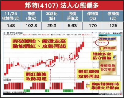 血液透析相關耗材製造商邦特(4107),為台灣第一家通過CE MARK、GMP及FDA 510(k)國際認證及獲美國FDA查廠通過的專業醫療器材製造廠。主要利基題材有:(1)受惠菲律賓新廠產能逐步開出,第三季營收衝上三.○四億元,創單季新高,年增四.八%,毛利率四二.七五%,加上台幣貶值,第三季有二千多萬匯兌收益挹注,單季稅後盈餘首度突破億元大關達一.○二億元,年增三六%,EPS達一.四五元,累計前三季EPS為三.一一元,已逼近去年全年三.四三元獲利總和。(2)隨著菲律賓新廠陸續取得歐盟CE認證及菲律賓PFDA執照,目前已開出的產能約一○%,申請中的FSC自由銷售許可及CPR產品銷售登記,預計約在年底入手,取得FSC之後,將可進一步行銷全球,預計每月產能將由目前二.八萬條擴充至五萬條以上,藥用軟袋也可彈性擴充一五%左右。在訂單增溫、高毛利率導管類產品比重逐步攀升及新產線逐步量產開出下,不僅第四季營運持續看旺,續創新高可期,且明年營運及獲利年增率將可望更上一層樓,本土券商同步喊進。(3)政策加持,不僅大陸十三五計畫將健康醫藥相關產業列為下一波國家戰略,民進黨總統參選人蔡英文也端出政策牛肉,預計成立亞太生技中心,醫療器材、新藥和疫苗研發列為重點發展領域,都將有利於生技產業長期發展。操作建議:低接不追高,守穩前低一二五元關卡不破,逢低於十日線附近仍可留意,或可參見「財神系統」之多空訊號進行短線價差操作,設好停損停利。