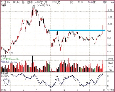 台灣十月外銷訂單金額四二五.五億美元,年減五.三%,連續七個月衰退,按貨品別觀察,資訊通訊產品創歷年單月新高,年增一一%;半導體、液晶電視年減四%,精密儀器年減二四.五%,塑膠製品年減一二.三%,化學品年減五.九%,基本金屬年減一七.五%,機械產品年減一八.六%。可見iPhone及手機相關產品仍一枝獨秀支撐台灣經濟。反觀股價波動上,近三個月指數由七二○三大漲至八八七一,生技股是最大贏家,蘋概股及手機相關零件卻是最弱,甚至完全沒漲,十二月是否有機會接棒成為主流,值得特別留意。手機部分特別要談到,進入4G時代PA(功率放大器)需求大增,成為今年成長幅度最大產業之一。其中宏捷科(8086)透過美商Skyworks成為蘋果供應鏈,今年一至十月營收三六.六三億元,年增八六%,前三季EPS五.九一元,年增四六二%,全年可達八元以上,是公司成立以來最佳成績。明年度除了4G PA持續成長,車聯網應用激增,安全輔助駕駛、自動停車、胎壓偵測等車用電子需求強勁,宏捷科新產品GPS-LAN(低雜訊功率放大器)已開始量產出貨,明年車用產品營收占比將挑戰一五~二○%,成為另一項高成長產品。公司表示,明年在GPS、4G PA及無線網路三大主力產品同步成長下,業績看來很樂觀。宏捷科股價從六月一二九元跌到八月六二.五元,連續三個月只維持七十至九十元間築底,近日站上頸線九十二元後有開始補漲機會,本益比僅十一倍。