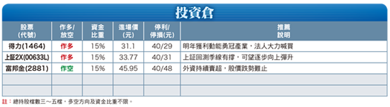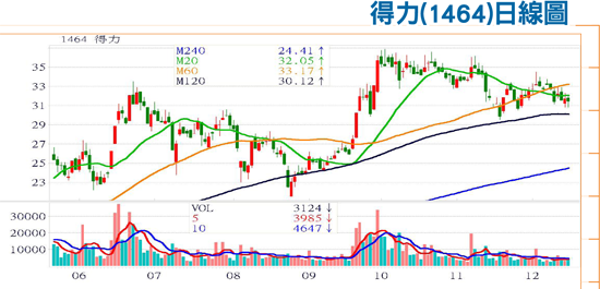 隨著油價走跌,石化、紡纖上中游原料價格同步走低,紡織下游將因原料成本下跌得利,吸引法人開始回補儒鴻(1476)及聚陽(1477)等成衣廠指標股,若此買盤延續,加上特殊聚酯加工絲、長纖織布業、染整業等訂單能見度多可看到明年第二季,可望激勵紡織族群上演新一波反攻行情。此外,TPP(跨太平洋夥伴協定)也是紡織股的一大利多題材,因客戶端已逐步將訂單轉向有在TPP成員國設廠的廠商,因此,紡織業早已啟動新一輪東協的投資,像是台塑集團、遠東集團、力麗集團、南紡(1440)及儒鴻都決定加碼越南。織布廠得力(1464)則將與成衣廠台南(1473)策略合作,攜手前進越南設立織布、成衣代工一貫化代工廠,藉由台南在東南亞布局經驗豐富及得力所掌握運動品牌客戶,拓展全球運動市場的商機大餅。凱基投顧也看好得力將是UA持續高成長趨勢下的主要受惠者,預估明年獲利年增四○%,將是明年紡織類股中成長動能最強的公司。隨著越南新產能陸續開出,預估未來三年產能每年均可增加一五%至三○%,增添長線營收的成長空間。就技術面觀察,得力也算是紡織股中最強勢的一檔,股價仍在半年線之上,接下來只要向上突破攻擊,各天期均線很容易就轉為多頭排列,公司為了因應越南蓋廠的資金需求,近日將辦理現增及發行CB,更增加未來股價向上發展的可能性。