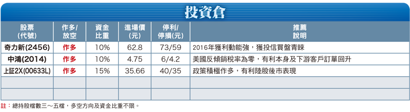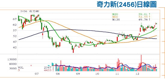 受外資放假影響,台股交投熱度大幅下降,造成成交量持續維持在五百億元的低量,盤面個股難有太大的表現空間,連帶操作難度也跟著提高。不過,此時倒是可留意法人近期積極佈局的個股,待未來量能回溫後,股價向上反應的機率相對較高,例如投信買超力度增強的奇力新(2456),就是投資人可以鎖定的潛力股。奇力新已於越南廠十二月底進行第一階段廠房動土儀式,預計二○一六年第二季完工,第三季投入營運,公司已著手把中國大陸部份產能轉往越南,可節省人力成本及費用,待三階段廠區全數完工後,新廠面積將超過現有全數面積,可滿足未來十年營運成長的需求。公司近年也積極降低PC及NB等應用,轉向高毛利的車電、工業用產品,車電產品線營收佔比已由二○一四年的三%提高至二○一五年的五~六%,今年目標更將提高至一○%,成為重要的成長動能。公司也看好4G手機對○二○一尺寸高頻電感的需求,月產能從二○一四年的五至六千萬顆,擴產至二○一五年第四季十億顆,二○一六年會新增○二○一精密線圈,單價是○四○二精密線圈的三倍,初期提供給韓系手機廠,預估可增加營收五億元,佔營收比重近一○%,將是公司另一成長動能。