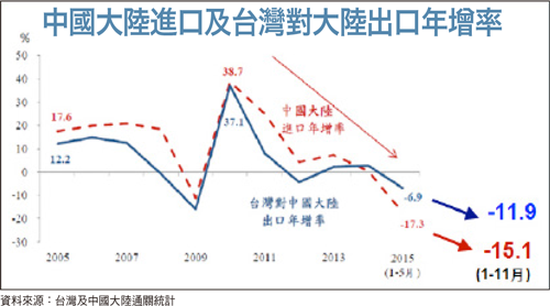 此外,反映在中國大陸進口與台灣對大陸出口的年增率變化上,二○一四年出現了明顯的轉折,就是雙雙跌落到負值之下,其中,中國大陸進口年減幅二○一五年一至五月已達一七.三%,一至十一月累積也有負一五.一%水準;台灣對中國的出口年減幅,則從二○一五年一至五月時六.九%,持續擴大到一至十一月的負一一.九%。這兩項數值的大幅衰減,都顯示中國大陸廠商已開始全面取代台廠在各大產業的供應鏈地位。換言之,台灣廠商與中國廠商目前已經進入到「肉搏戰」的產業競爭,此時,人民幣的重貶,不僅將帶動中國的出口競爭力,更會同步削弱台灣的相對競爭力,而紅色供應鏈對台廠的威脅,也就在人民幣重貶的助陣下大為提高。總結而論,人民幣持續重貶所引發的亞洲貨幣戰爭,以及各國之間出口的競爭肉搏戰,不僅將牽動二○一六年全球金融市場的穩定,更會形成在投資市場中不可忽視的一隻黑天鵝。