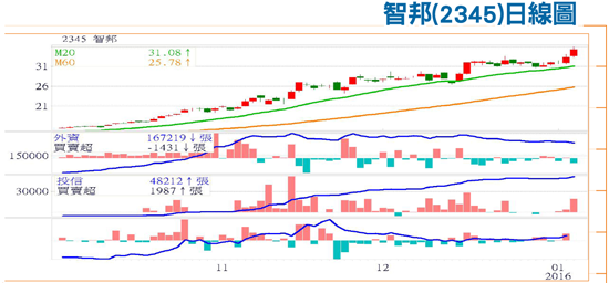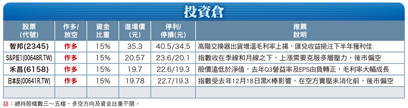 智邦(2345):營運轉機股。搭上雲端資料中心交換器商機,加上切入企業級雲端基地台,有助於毛利率的改善。看好業績成長爆發力,市場買盤積極卡位,連帶股價表現也令人刮目相看。第四季隨著高階交換器出貨增溫,毛利率有機會上揚,若再加上匯兌收益挹注,下半年獲利跑贏上半年有望。S&P反1(00648R.TW):「元大標普500傘型證券投資信託基金之標普500單日反向一倍證券投資信託基金」。標普500指數和油價有相當的連動性,先前雖然跌深反彈,但受到伊朗放話增產的利空消息,再度向下修正,指數目前收在季線和月線之下,如果要上漲需要克服多層壓力,後市偏空看待。禾昌(6158):營運轉機股。主要從事各種沖壓零件、電子端子和各種連接器等製造、加工、買賣。其中應用於液晶面板、監視器及液晶電視之銷售比重占八成。禾昌因股價遠低於每股淨值,近期獲買盤力挺,股價帶量上攻,去年第三季營益率及EPS由負轉正,毛利率大幅成長。日本反(00641R.TW):中文名稱為富邦日本東証單日反向一倍基金,主要投資地區為日本,投資標的為反向型。從技術面來看,指數目前受到去年十二月十八日帶長上影線黑K棒的影響,如果要上漲,需要克服較大的空方壓力,月線持續向下,未來有形成死亡交叉的危險,後市持續偏空看待。