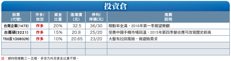 二○一六年一開市,金融市場就風雲變色,在人民幣連續貶值,陸股走跌下,就國際情勢而言,因為沙烏地阿拉伯與伊朗斷交,國際原油價格波動變化大,影響大盤走勢,而金融股因離岸人民幣(CNH)商品的關係,首當其衝。電子股權值股由於去庫存壓力干擾下紛紛股價下墜。依照目前整個趨勢而言,空頭力量逐漸逼近,所有反彈請暫時站在賣方,等到盤面回穩多頭才有機會反攻。台南企業(1473):柬埔寨及印尼廠從去年十月底開始產能全開,雖然十一月營收五.四五億元,較上月衰退了二六.四二%,主要是因為訂單往後延遲,在稼動率全滿下,對今年第一季展望樂觀。為了減少虧損,台南企業二○一五年主要針對自有品牌Tony Wear進行調整,年底縮減門市至六家,預計今年將只剩兩家門市,而且不出新貨,以消化庫存為主。至於代理的女裝品牌在去年第四季已轉虧為盈,預估今年虧損縮小下,獲利將可明顯改善。台嘉碩(3221):二○一五年第四季合併營收預估可創下新高,車用產品比重提高,毛利率、獲利同步看增。受惠於中國手機市場回溫,台嘉碩去年第四季營收應可改寫歷史新高,單季EPS挑戰○.八~一元,全年EPS上看一.六~一.八元,創下近年新高。
