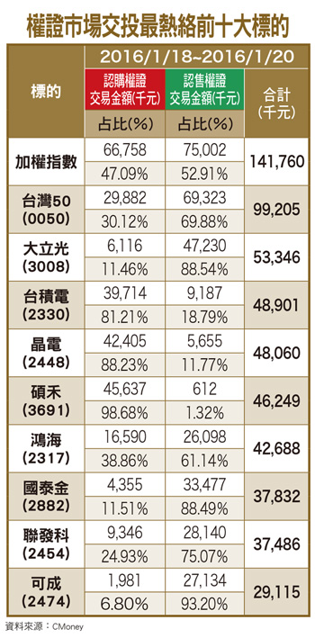 看本周三檔認購成交金額大於認售標的。台積電(2330)法說會中指出受惠智慧型手機市場回溫,今年全年半導體產業可望成長二%,預估台積電業績將成長五%至一○%。加上儘管選後貨貿談判全面暫停,但南京十二吋新廠申設案,經濟部工業局可望一月底前完成技術審查,之後送交投審會,有機會農曆春節前過關。選後政黨輪替,新政府政策相關概念效應陸續發燒,LED廠晶電(2448)去年十二月營收二一.六億,月增一九.一四%,年增六.四五%。市場認為晶電下游客戶庫存水位低加上照明應用出貨量增加,營運緩步增溫。加上股價過低及大股東股權分散,屢傳被併消息,本周再傳有私募基金有意併購,股價從選後放量往上態勢仍吸引不少認購投資族群。碩禾(3691)去年第四季營收創歷史新高,十二月業績為連九個月新高。股價跌至半年線附近,近日配合營收消息及子公司上興櫃的反彈,也吸引不少認購族群。當然,人多的方向不一定對,市場消息也不一定確實,但可以為投資參考。權證的好處就是若行情符合預期,運用槓桿的效果將放大,若非,最大的損失金額也在一進場時就能確定。