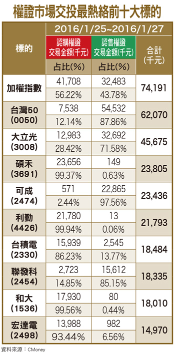 蘋果一月二十六日發布最新財報,儘管上一季營收、獲利皆創歷史新高,但iPhone銷售及財測皆不如預期,市場預計這一季可能iPhone會迎來首度銷量衰退,營收也可能十三年來首度下滑。隨著蘋果成長動能放緩,對於蘋概股投資人在權證市場上也站在比較看空的一邊。大立光(3008)第一季淡季效應看起來比去年嚴重,營收下滑幅度會大於去年。不過其法說會時透露,「今年有大客戶會採用雙鏡頭」,外界直接解讀為蘋果iPhone 7,能否用雙鏡頭來彌補蘋果成長動能趨緩,可以持續觀察。可成(2474)也是一樣,雖然近期股價有暫時止跌現象,但因先前大幅修正,市場上認售權證都較為價內金額相對高,認購權證則相反,因此可能成交張數相當,但認售金額明顯大過於認購。和大(1536)去年十二月合併營收四.七九億元,創歷史單月次高,年增二七.五八%;第四季合併營收一四.三一億元,也創單季歷史新高,去年營收超過五十億元,年增逾二成。由於Tesla將在三月確定其Model 3的設計與供應商名單,市場預測和大進榜機會不小,也刺激近期股價走勢,不少投資人利用權證的槓桿積極參與此波漲幅。