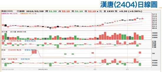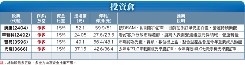 漢唐(2404):營運成長股。公司在前年下半年切入中國大陸光電廠,並在去年貢獻業績,去年度公司也接下DRAM、封測等半導體相關客戶訂單,目前公司在手的訂單量仍有逾百億元,今年營運持續樂觀。華新科(2492):營運成長股。近年積極分散客戶佈局,並深耕中國手機客戶,在車用、工業、網通及手機需求平穩下,致第四季維持高檔;而展望今年,公司看好客戶分散佈局持續發酵,擬跨入表面聲波濾波元件領域,可望驅動今年營運持續轉佳。智易(3596):營運成長股。產製及銷售無線區域網路產品、整合性數位家庭及行動辦公室之多媒體閘道器產品、無線影音產品。去年第四季在客戶急單帶動下,單季每股獲利達一.一九元,總計去年每股獲利三.○六元;展望今年,市場認為光纖產品、寬頻產品、數位機上盒、整合型產品將會是今年重要成長動能,持續看好智易今年成長走勢。光耀(3666):營運成長股。產品為標準聚光片、高輝度增益聚光片、超高輝度增益聚光片、無干涉紋聚光片、整合性擴散聚光片及高挺抗刮性的高輝度多功能複合型聚光片。光耀轉型有成,繼去年拿下韓廠LG車載面板光學膜訂單後,今年再取得LG七款手機光學膜訂單,將自下季起陸續出貨。累計今年前二個月營收二.一三億元,年增三六.三%,本季營運淡季不淡。