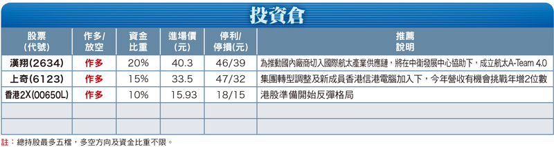 台股這一波資金行情延燒,從農曆年後看回不回,直走到年線附近才遭遇不少阻力。這一波行情來得又快又急,先前市場擔心人民幣貶值帶來TRF的損失,且國際油價波動激烈,歐洲央行又要實行量化寬鬆(QE),的確造成長線投資人與機構法人被迫回補空頭部位。軋空與軋空手行情,進一步推升台股漲勢。漢翔(2634)今年在民用機部分,有機匣三廠與複合材料二廠新產能加持,以及國防部IDF維修業務持續帶動下,預期今年營收有望拚成長一○%;明、後兩年則因為新廠產能持續開出,以及日本三菱MRJ訂單,估計營收成長幅度會較今年更高。另外,漢翔為推動國內廠商切入國際航太產業供應鏈,將在中衛發展中心的協助下,成立航太A-Team 4.0,以倍增台灣航太產業產值目標而努力。 上奇(6123)主要係代理暨企業用戶事業群業務成長,以及新投資公司併入營收。市場預期。儘管公司認為今年國際情勢仍不明朗、內需疲軟,但透過轉型調整、產品組合優化、營運效率提升,以及在集團新成員「香港信港電腦」加入下,預期今年在粵、港、澳及東南亞企業與教育用戶市場應有表現,包括代理暨企業用戶事業、辦公室用品、數位列印等,依然是公司未來的布局重點。市場預期,上奇今年營收有機會呈現兩位數成長。