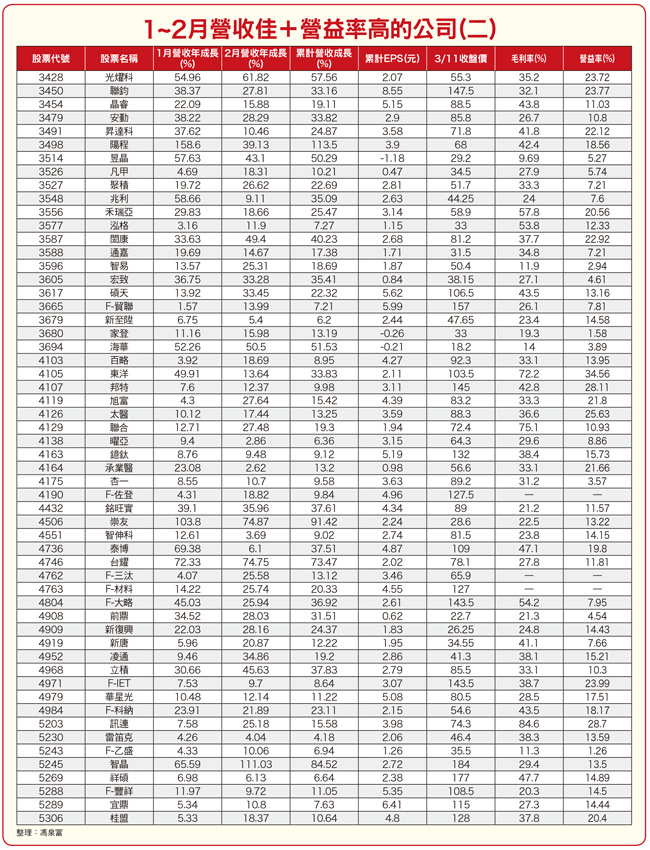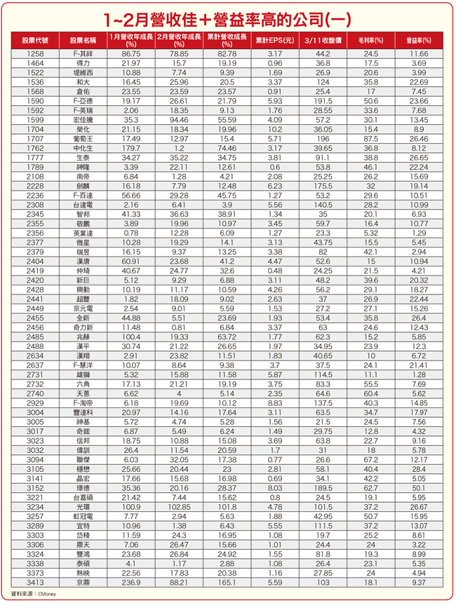營收+財報 決定個股續航力上周提到個股一~二月的營收很重要,如果在台灣出口訂單連續二位數衰退的狀況下,還能異軍突起表現優異的公司,大致上都具備特別的競爭優勢,也將是基本面值得持續追蹤的標的。例如一月十二日提及的同致(3552),雖然當時股價已接近三百三十元,但由於營收成長的透明度非常高,市場仍將給予高本益比的評價。主要原因是,美國國家公路交通安全局宣佈,二○一六年五月起在美國販售之新款車,重輛低於一萬磅之乘用車至少一○%配備倒車影像,而二○一八年時制定所有出廠新車都必須配備倒車影像系統,此舉將更加確定倒車影像在汽車安全配備產業的長多趨勢,估計在美國即可創造出每年一五○○萬套CMOS、超過七億美元的商機,且如同TPMS 一樣,預期未來將有更多國家追隨美國的腳步強制加裝,倒車影像未來商機龐大。時間是站在同致(3552)這邊,果然最高來到四百七十一元。筆者主要的用意不是要投資人去追同致,而是要讓大家了解漲升的背後原因。由為升(2231)再到同致,未來還有類似的機會嗎?根據J.D power 二○一五年全美消費者滿意度調查報告指出,美國汽車消費者最感興趣的五種汽車新配置為盲點偵測、夜視、防碰撞、智慧後視鏡與自癒車漆,目前防撞系統是全球各大車廠積極朝普及化發展的方向之一。NHTSA(美國國家公路交通安全管理局)已宣布將自動煞車系統(crash imminent braking, CIB)與動態煞車(dynamic brake support, DBS)兩項主動式煞車輔助配備列為新車推薦配備項目之一,這樣的商機台灣也有代表性的關聯廠商,就是一月份曾推薦的F-IET(4971),其主要業務為三五族化合物半導體磊晶片,已切入Skyworks、安捷倫、美國國防部等重量級客戶供應鏈,其中GaAs磊晶片就應用在微波、高頻通訊(雷達、基地台、GPS)市場,如汽車防撞安全系統、物聯網