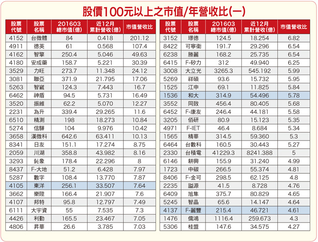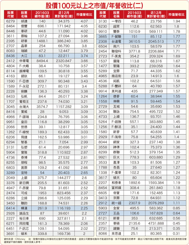 指標股1:台積電我們再以指標股細部剖析,投資人將更了解台股結構的輪廓。台積電市值早已創歷史新高(約四‧一三五兆),未來的發展該如何推估呢?由圖表一觀察,如果台積電總市值要再繼續向上成長,則必須見到營收持續拉升,提供外資持續買進的誘因。台積電總市值除以近十二月營收比值目前來到五‧○一,過去停留在五以上的時間並不長。這可能有兩種發展,其一是近十二月營收柱狀圖持續明顯增長,則台積電可續漲而比值在五以上停留時間較久;其二是營收增長不明顯,遇有國際利空則比值下降(股價下跌)。目前美股半導體大廠INTEL市值除以營收比約為二‧五九。指標股2:大立光由圖表二觀察,台股股王大立光面臨一樣的問題,由於營收動能暫時性熄火,先不管是季節性因素,還是面臨紅色供應鏈的影響,或者是兩者皆有。近十二月累計營收的柱狀圖不再挺升,讓大立光歷經股價巨幅修正後的反彈,市值/營收比值還是無法回到高點附近(目前比值為六‧二六,近年高點為九‧五七)。當然,也有可能是先前市場過度高估,因為美國Apple目前市值/營收比約為二‧二六,本益比約十一‧二倍。意思就是說,股王大立光要維持目前的市值或甚至增長,最好每個月的營收年增率是正的、明顯的成長率。指標股3:為升、同致、和大我們近一步看高價的汽車零組件個股,為升之所以維持高價與同致能持續大漲,基本上可由圖表明顯得知,其營收成長動能維持強勁。市值除以營收比的內涵意義是,先不管營運的所有成本及稅金,一家公司需要累積多少年的營業收入才等同目前的股票價格,因此,我們可用此模型約略推估哪一些公司估值可能偏高或偏低。因為在時間的推演過程,市場可能出現競爭者或其他需求變數。所以,市值除以營收比偏高的公司,除非有特殊的競爭門檻,否則對投資人而言,中長期風險增加。目前美股具指標性的企業,亞馬遜市值除以營收比約二‧五五,Google約六‧七七,Intel約二‧五九,Apple約二‧二六,都是具有國際競爭力的跨國公司,市場流動性十分良好,將是未來的重要參考指標。其中的美股亞馬遜,雖然目前獲利很少,本益比高達四六六倍,但營收成長動能都保持在二○%以上,目前市值除以營收比約二‧五五,足供未來讓台股新創公司有一個參照標準。雖然不同行業有不同的特性及標準,但至少讓投資人有評估投資風險的參考依據。以上所述,主要目的是提醒投資人不要失去風險警覺性,未來不論行情如何走,總是會有成長透明度高,且價值被低估的標的出現,投資人可以現在就列表追蹤,配合技術面等待未來適當的切入點。