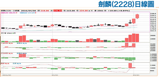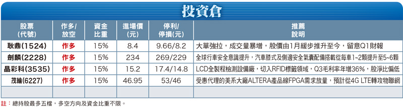 耿鼎(1524):營運轉機股。主要從事生產汽車後售市場的金屬碰撞件,主要產品為葉子板、引擎蓋、車門等。耿鼎出現大單強拉,成交量暴增。股價由一月緩步推升至今,成交量驟增。留意今年第一季財報。股價維持在一定區間,成交量也相對穩定,急拉後,如量能萎縮,則需再防陷入整理,技術面以五日線支撐為參考。劍麟(2228):營運成長股。公司主營產品主要分為汽車氣囊零組件、百貨展示架及衣架兩大類產品。在全球行車安全意識提升趨勢下,汽車膝式及側邊安全氣囊配備搭載數量,從原本平均每車一到兩顆提升至五到六顆,預縮式安全帶精密導管與電子動力輔助方向盤轉向系統在新車款配備的滲透率亦穩定提升。晶彩科(3535):營運轉機股。產品營收比重自動光學檢測機及維修收入佔比九八%,RFID標籤及電子產品佔比二%。台灣LCD全製程檢測設備廠,切入RFID標籤領域,第三季毛利率年增三六%,股價淨值比相對偏低,去年十二月營收一.八五億元,月增二.六八倍、年增十二.二二倍。茂綸(6227):題材概念股。主要業務為電子零組件及成品之代理銷售,受惠代理的美系大廠ALTERA旗下產品線FPGA需求放量,今年預計要從4G LTE轉攻IoT(物聯網)應用,針對智能水表、智慧電表等較具成長性的應用面著力,盼再添營運動能。