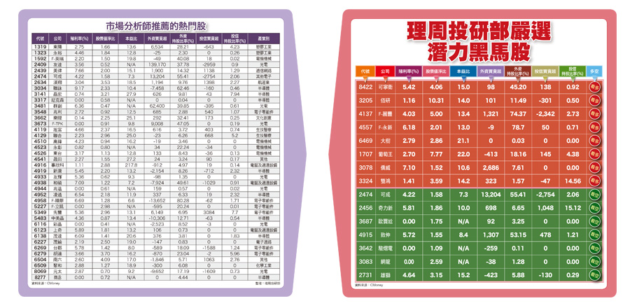 大盤自四月七日盤中低點八四三六點觸底彈升以來,短線最多大漲三○七點,漲幅三.六四%。但由於連續九個交易日反彈漲勢,盤面呈現「價漲量縮、量價背離」格局,想攻下前波漲勢反壓高點八八四○點,仍有相當難度。唯受惠多方力守中多格局,大盤也得以守穩於十年線、季線、半年線等多道重要支撐關卡。短線持續震盪整理 利多股爭出頭本周理周投研部精選鏢股,主要以近期外資、投信著墨較深,具籌碼面優勢,未來有機會因產業基本面前景展望佳,營收獲利成長動能強,股價尚未脫離合理進場價位,殖利率佳,有望因法人進場挹注走出波段上漲行情者,如:僑威(3078)、雙鴻(3324)、F-麗豐(4137)、可寧衛(8422)等。