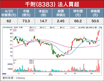 千附(8383)為台灣工程設備及精密元件的領導廠商,營運範圍包括精密科技(航太、光電、半導體)、製鞋機械設備、管路及系統整合與水資源等四大事業。在多角化經營的效益顯現下,近五年每股獲利(一.○二元、一.三元、一.六三元、三.○四元、三.五三元)逐年向上提升。千附主要客戶,包括台積電(2330)、寶成(9904)、豐泰(9910)、F-鈺齊(9802)、漢翔(2634),以及GE、BOEING、Applied Materials等國內外一線大廠。以漢翔為例,四月十四日發動機機匣三廠落成啟用時,就特別提及結合千附等外包廠商的產能,目標是成為世界級的發動機機匣製造中心。穩定的合作關係,將有助於千附營收的成長。此外,聯合國資料顯示,全球將近一半人口用水短缺,水資源已成為全人類最大的風險。而美國麻省理工學院的研究報告亦指出,在二○五○年前,亞洲恐將有高達十億人口面臨高度缺水的危機。千附於二○○六年起積極投入水資源回收工程與海水淡化廠的開發,二○一二年完成台灣最大的海水淡化廠,並於澎湖馬公、望安等地營運,每天約可供應一.○四萬噸水。成功的經驗,將有利於千附拓展水資源的市場。根據千附自結財報,三月營收約三億三三九萬元,月增五三.三一%,年增四三.四四%;累計一至三月營收約七億九八四九萬元,年增二四.二四%(基本面資料若有異動,仍須依據公開資訊觀測站最新訊息) 。操作建議:短底成形,急漲不追,逢回五日均線進場布局,同時設定停損、停利。