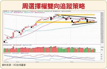 蘋果(Apple)公布近三個月期間季度財報,截至三月底蘋果iPhone銷售量約五千萬支,較上一季大減三成。為iPhone問世以來,成長速度最小的一次,iPhone營收佔蘋果單季整體營收比重高達六十五%,蘋果截至三月底單季營收約五百億美元,跟上一季相比,減少了三成。美國科技業龍頭蘋果公司財報出現重大警訊,顯示出科技業的未來並不是很樂觀。美國商務部公布二月工廠訂單減少一.七%,雖符合市場預期,卻是十九個月來第十四個月下滑。二月耐久財訂單衰減三%,跌幅比初估值還大。此項的經濟數據下滑,顯示出美國經濟成長尚未重拾動能。台股近日高點不過前高,低點不破前低,形成狹幅三角收斂。從扣抵值來看,年線將持續下彎,月線持續走平,季線逐漸往上與年線與月線靠攏,三均線糾結可能性高。指標DMI顯示目前多空力道相當,加上缺乏量能的狀況下,近期盤勢多為震盪整理。三大法人合計期貨淨多單,外資期貨仍為淨多單,目前期貨未平倉淨多單五萬五千六百五十七口,前十大交易人多空比大於一,觀察自營商選擇權部位,買進買權及賣出賣權,從外資期貨部位和自營商選擇權部位來看,顯示法人偏多看待,技術面的糾結,與量的持續萎縮,多空即將表態,目前買權與賣權的隱波率都偏低,可布局突破策略(買方跨式或勒式)因應。