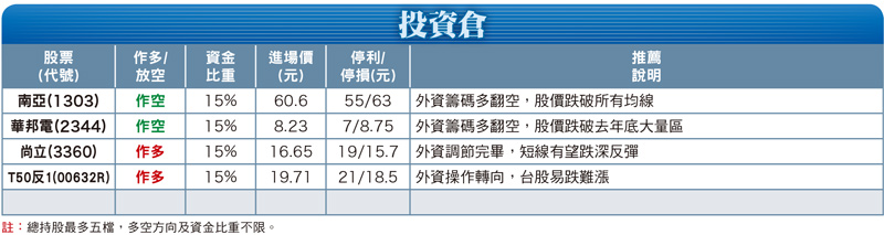 由於台股結構惡化情況越來越嚴重,股價跌破所有均線、型態翻空的股票,一路由先前中小型股擴散到中型一○○成分股,再到近日的台灣五○成分股。目前股價各天期均線形成空頭排列的個股,即市價低於月線低於季線低於年線,已接近六○○檔,占所有上市櫃股票比重逾三成,空頭趨勢已逐步成形,台股的修正行情恐怕才剛開始。另觀察外資籌碼也明顯有鬆動的跡象,截至五月四日,不僅現貨連四賣,累計賣超超過四○○億元,期貨未平倉多單也連五降,離高峰已大減四成。進一步看到個股籌碼變化,更加確認操作轉向的可能性,像是權值龍頭台積電(2330)已遭連續提款五日、台灣五○(0050)連五賣及台灣五○反一(00632R)連五買等。外資顯然已成為本波台股修正的賣壓主要來源,故外資先前買超較多的權值股,均將面臨反向調節的風險,建議投資人暫時先避開。反倒是先前股價領先修正的中小型股,短線上或許有機會出現跌深反彈的逃命波行情,應是積極型投資人操作搶反彈時可以考慮的方向。例如主要代理Sony CMOS影像感測器(CMOS Image Sensor)的尚立(3360),隨著Sony智慧型手機用CIS主力據點「長崎工廠」在熊本大地震後陸續復工,加上品牌客戶新款搭載雙鏡頭新機已於四月上市,拉貨力道可望開始轉強,有助股價止穩回升。