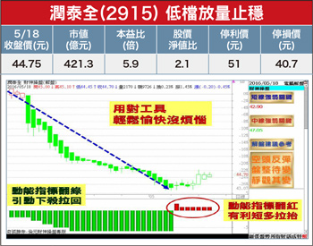 潤泰全(2915)以產銷棉胚布、先染布、後染布、量販暨零售及投資興建一般公寓住宅等為主,本業兩大主軸為紡織及量販,目前持有高鑫股權一二.六七%、潤泰新股權二六.二四%,以及透過潤成投資入主南山人壽(目前持有潤成股權二三%),為潤泰全業外轉投資三大金雞母。主要利基題材有:(1)去年獲利亮眼:受惠南山人壽、中國大潤發及同集團的潤泰新獲利成長挹注,去年EPS續繳出八.五七元超亮眼成績,唯受制於南山人壽投資失利,去年綜合損益出現四○四億元備供出售金融資產未實現損失,須依投資比例認列轉投資未實現跌價損失,使得今年股利大幅縮水,擬配息一.六元現金股利,使得外資持續減碼,股價慘遭修正拉回。(2)首季EPS創同期新高:除了本業維持穩健成長,加上來自轉投資潤成(南山人壽)貢獻獲利約十二億元,高鑫零售(中國大潤發)貢獻獲利約五.五億元,及潤泰新挹注獲利約五億元,首季獲利年增逾五成,EPS二.五一元創同期新高,只是屋漏偏逢連夜雨,隨著浩鼎風暴持續擴大,也讓潤泰集團尹衍樑旗下潤泰家族再一次遭受市場打擊。(3)就技術面及本益比來看,隨著股價嚴重超跌,且本益比下降至約僅五倍,配合低檔放量止穩,KD隨機指標及MACD趨向指標呈現黃金交叉向上,隨時可望有一波絕地大反攻契機(基本面資料若有異動,仍須依公開資訊觀測站最新訊息為主)。操作建議:低接不追高,只要不再放量殺盤破前低下限三%以上,逢低於十日線附近可留意,或可參見「財神系統」之多空訊號進行短線價差操作,設好停損停利。