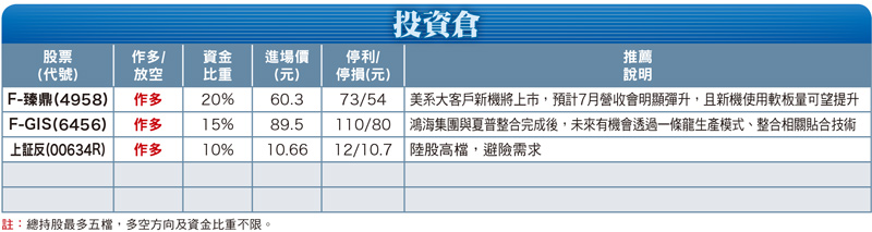 五二○結束後第一個交易日,台股以大漲二百多點收盤,破解了五二○魔咒。為何以前台股在五二○都有下跌空間,這次卻有反彈機會?關鍵在於新政府上台前,所有投資人都不看好未來時,其實盤面都會反向思考,也就是「八二法則」,當所有人方向一致時,當中會賺錢的法人、大戶一定會跟所有人不同,這也是金融市場可愛之處。現在大方向考慮是美國六月升息不確定性,還有股東會回補行情,這也是作手考慮的方向,大盤未來拉回不跌破八千點時,代表多頭即將來臨。F-臻鼎(4958)第一季受銷售淡季、價格壓力及匯損衝擊,第二季雖然市況仍疲弱,美系大客戶仍在新舊產品交替期,再加上價格壓力仍在,而在陸系手機需求支援下,第二季營收略微回溫,但考量到匯率波動較為平穩,業外匯兌損失會大幅縮小,第二季獲利會回升。第三季美系大客戶新機將上市,預計七月營收就會明顯彈升,且新機使用軟板量可望提升,再加上F-臻鼎在大客戶滲透率增加,可望彌補ASP下滑壓力。F-GIS(6456)第二季預期在客戶調節庫存下,應該是營運谷底。第三季將受惠大客戶新款手機拉貨,帶動整體營運向上,去年上下半年營收比例約三五:六五。鴻海集團與夏普整合完成後,公司表示,未來將有機會透過一條龍生產模式、整合相關貼合技術,未來對客戶布局更加完整。