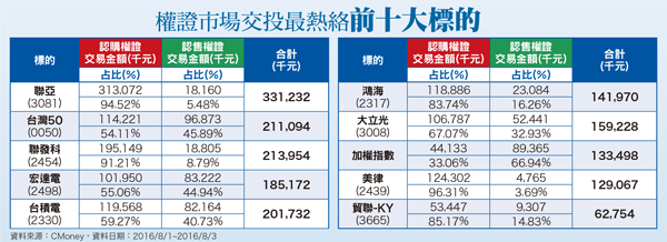 本周榜單比前幾周有較明顯的變化,在摩台結算後,之前支撐指數一路往上的權值股近期休息,反而是有產業前景話題性或是業績發展良好且碰到即將除權息之標的受投資人青睞情況有增多趨勢。光通訊客戶在第二季中興遭美制裁,需求急凍,客戶拉貨轉趨保守,庫存要用到見底才會下急單。對聯亞(3081)而言,七月營收會比六月稍好,七月中之後股價持續緩步往上,八月二日除權息更吸引大量買盤進入,可見市場對其未來行情的期待。新進榜標的也有同樣的現象。美律(2439)八月五日除權息,配息三.二三九七,第二季EPS一.七五元。在引進中資立訊入股六月遭投審會駁回後,董事會通過孫公司香港美特與立訊簽訂合作意向書,立訊擬投資香港美特旗下全資子公司蘇州美特,取得四○~六○%股權。市場對其未來展望,也展現在七月中之後股價從七十元附近來到八月二日最高一○二.五元。近期可以觀察到業績不錯或是具有成長性且即將除權息標的,都吸引投資人進入權證市場,也可見投資市場對於未來填權息行情的預期,未來一個月也還有不少標的即將除權息,投資人可研究其相關產業發展或填權息機率據以選擇。