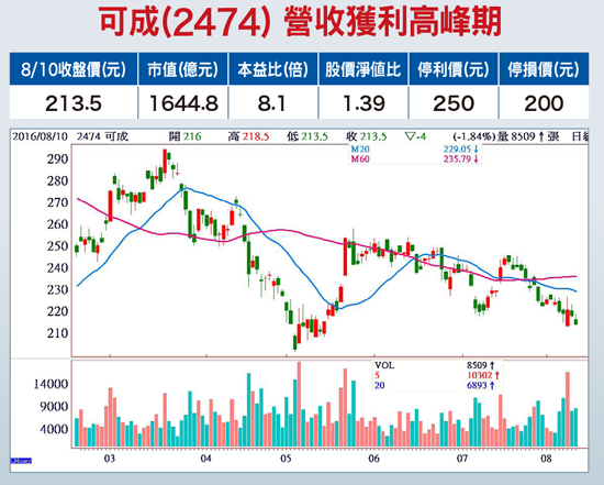 金屬機殼廠可成(2474)第二季受新舊產品交替、需求不盡理想衝擊,EPS僅五.○一元,創近八季新低。上半年累計營收三四三.六七億,合併稅後盈餘八○.二七億,年減一八.九七%,EPS十.四一元。但可成預告以及法人指出,伴隨新iPhone及新MacBook將於第三季末至第四季推出,在經濟規模成長、新產品導入以及傳統旺季效應,將重返成長軌道,預期下半年較上半年將有高達四成的明顯成長空間,預估今年EPS約二十六~二十八元。以配息十元計算,現金殖利率達四.六%。蘋果和台郡因第二季為今年營運谷底,在公布第二季財報前因市場擔心看壞都先行拉回整理,不過財報公布後加上對第三季展望樂觀,股價果然都以利空出盡反應並創下近幾個月波段新高。蘋概股近日在第二季財報公布,反應把握利空出盡的另一次波段買點。近三個月,五月初公布第一季財報後利空出盡,可成股價從二○一元漲到二五八元,七月初公布六月營收後也從二一七.五元漲到二四五.五元,八月五日公布第二季財報後,會不會又是另一次利空出盡短線或波段買點?值得拭目以待!可成七月營收達五九.九六億元,月增六.九%,也呼應董事長洪水樹在股東會上預估的「下半年成長力道轉強」說法。按歷史來看,可成每年營收獲利高峰期多落在八~十一月,若無意外,八月營收將較七月更加成長!搭配預計九月八日除息前剛好公布八月營收,未來這一個月,在第二季財報利空出盡後,可成股價開始一路走高拉高至除息前的機率應該很大!
