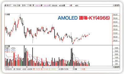 根據研調機構IHS報告指出,目前AMOLED與LCD的生產成本已經大幅拉近,AMOLED與LCD在今年第一季生產成本分別為十四.三美元及十四.六美元,預期二○二○年AMOLED市占率將會大幅提升至三○%,可以預見的是,AMOLED 已經兵臨城下等待取代TFT-LCD,目前AMOLED全球三星(Samsung)獨占九五.八%市占率,也帶動三星股價年度漲幅達到五八%,再創歷史新高。面對韓商已全面掌控AMOLED面板,而蘋果(Apple)又即將採用此一技術,經濟部日前宣示,將結合面板雙虎(友達、群創)等業者,砸千億銀彈組成AMOLED面板「國家隊」,不難看出AMOLED的龐大商機。目前台廠在AMOLED面板投資及良率皆遠遠落後三星,不過AMOLED商機也並非吃不到,譜瑞-KY(4966)與韓國三星共同開發全球首顆AMOLED面板用時序控制晶片,譜瑞-KY的DP699時序控制晶片支援最新eDP Standard 1.4b標準,獨家供應三星最新的AMOLED顯示面板,譜瑞-KY可望成為AMOLED與LCD面板市場競爭洗牌後,少數的受惠大贏家。