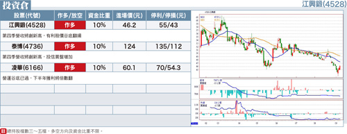 江興鍛(4528)為汽車傳動系統零件鍛造廠商,主要產品包括前輪及後輪傳動軸的鍛件、懸吊系統鍛件、底盤配件等,客戶包括DANA、AAM、NTN、台惟、和大、中華台亞等傳動系統製造商。上半年受北美DANA調整庫存,以及泰國NTN需求疲弱所影響,營收及獲利雙雙出現了衰退,八月又受中國部份車廠仍在暑休的影響,營收持續下滑,月減四%、年減六%。在營收動能減緩下,股價自去年底開始就一路走跌,甚至八月底除息後還出現貼息,股價進一步破底。不過,預期在第四季進入旺季後,營運有望出現轉機,股價也將有谷底翻揚的契機。包括北美客戶DANA爭取回部分車廠訂單,拉貨動能將逐步轉強;泰國客戶NTN訂單量增加;新增GKN、Neapco外銷訂單;中國淮安廠新機台到位,產能提升,又適逢年底中國車市旺季,客戶拉貨需求提高,預估單季合併營收將創歷史新高,將成為推升股價反攻的重要利多。明年在台灣廠恢復成長動能及中國廠持續成長帶動下,營收年增幅度上看二○%,EPS則有望超越二○一五年的成績,再創歷史新高紀錄。隨著營運即將步出谷底,今年第四季及明年營運將分別創下單季及年度新高,配合股價低基期的優勢,可望吸引不少資金買盤的目光,此時正是投資人進場卡位的好時機。