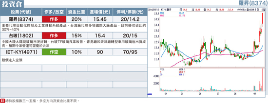這次美國聯準會升息預期驟增,加上美國總統候選人希拉蕊身體不適,為美國大選投下變數,引起全球股市出現第一次大幅回檔。不過不是每次多頭回檔還會創高,如果這種循環並未產生,小心空頭來臨。這一次外資大賣百億以上,未來如果持續大賣,投資朋友千萬不要逢拉回作多,因為多頭回檔可以作多,空頭反彈是作空使用,沒做到多頭是因為經濟面不佳,不敢進場,看到經濟好轉才進場,基本上準備套牢,因為金融市場多變,投資朋友也要善變,才不至於被市場淘汰。羅昇(8374):主要代理自動化控制及工業傳動系統產品,目前台灣廠約佔營收比重三○~四○%,而台灣廠代理多項國際大廠產品,像台達電(2308)就是羅昇長期合作夥伴,台灣廠每年獲利表現穩定。羅昇台灣廠營運波動不大,若要改善整體營運,關鍵仍在大陸廠,羅昇今年也將持續調整大陸廠,期望能使大陸廠營運早日回穩。台玻(1802):隨著今年中國大陸的太陽能玻璃市況好轉,加上台玻的TF玻璃良率改善,以及青島廠和天津廠轉型車用玻璃後出貨成長,預期今年營運可望優於去年。另外,台玻轉投資、持股三七%的實聯化工江蘇,去年已經達到全產全銷,今年營運可望虧轉盈,第二期生技鹽和鹼性飲用水也預計明年起陸續投入營運,屆時將可持續提升獲利表現。
