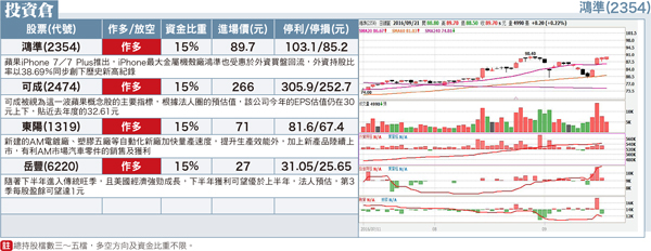 鴻準(2354)蘋果iPhone 7/7 Plus推出,來自通路的預購數量遠超乎市場預期,iPhone最大金屬機殼廠鴻準也受惠於外資買盤回流,外資持股比率以三八.六九%同步創下歷史新高紀錄。鴻準八月營收爬升至七十六.七五億元,月增一一.八九%、年減二.九五%,創下去年十二月以來的單月營收新高,累計鴻準今年前八月營收為五一三.五九億元,年減二○.○八%;預期下半年表現可望優於上半年。可成(2474)外電上週傳出iPhone 7的預購量為iPhone 6s的四倍之後,激勵外資買盤重回金屬機殼類股,推升金屬機殼股表現。可成被視為這一波蘋果概念股的主要指標,根據法人圈的預估值,該公司今年的EPS估值仍在三十元上下,貼近去年度的三十二.六一元。東陽(1319)今年上半年稅前盈餘十五.○二億元,每股稅前盈餘二.四三元,成長一一一%,創同期新高。今年獲利成長的重要來源在於新建的AM電鍍廠、塑膠五廠等自動化新廠加快量產速度,提升生產效能外,加上新產品陸續上市,有利AM市場汽車零件的銷售及獲利。岳豐(6220)今年上半年稅後盈餘達一億元,較去年同期大幅成長二.三三倍,每股盈餘為○.七七元,由於車用影音訊號線正式打入日系車廠,已開始交貨給車廠,隨著下半年進入傳統旺季,且美國經濟強勁成長,下半年獲利可望優於上半年,法人預估,第三季每股盈餘可望達一元。