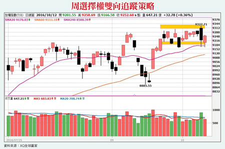 即便美國非農就業數據,連續多月呈現溫和增長趨勢,但市場普遍仍預期年底聯準會升息的條件已趨近完備,加上各個寬鬆陣營的主要央行,近期也不太可能加碼寬鬆,使得外資圈在新興市場的調節動作也開始頻繁起來,據南韓金融監督院(FSS)資料顯示,十月初外資累計淨賣出南韓公債的金額便高達一.七兆韓元(十五億美元),印度、泰國以及中國也同樣面臨資金外流。台股十一日開高走低,上演久違的殺多行情,在note7宣布停產後,先是引發中小型股的調節賣壓,盤中更因新台幣持續走貶,而引起外資撤離疑慮的恐慌,十二日止跌反彈讓市場情緒緩和不少,從日k型態來看,台股在九千兩百點的位置仍有支撐,預期指數仍會在九千二百點至九千三百點進行箱型整理。台指期外資十二日的未平倉淨多單為九萬一千七百零二口,自營商在選擇權部位同樣偏多布局,顯示法人對於台股後市發展仍舊樂觀,可逢低佈局溫漲(買權多頭價差)策略。