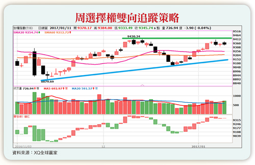 世界銀行(World Bank)在一月十日發表最新全球經濟展望報告,預期全球經濟二○一七年將增長二.七% ,可自二○一六年低位反彈,最主要的背後推手,將會是大宗原物料商品的價格推升,以及美國總統川普的經濟刺激方案;美國經濟若能加速增長,將帶動全球市場的動能,而目前的疑慮在於,川普的政策推行將如何籌措財源,若要繼續舉債,那麼今年三月十五日的美國債務上限到期日將會是觀察重點。加權指數本週在九四○○點前止步,盤勢再次陷入區間整理,近期台股的交易依然清淡,週一在證交所股價最高價設定的影響下,造成股王大立光遭熔斷二十二次,大盤波幅一度放大,但後市表現平淡,加上外資近期在台股並未出現大動作,農曆春節封關前,市場波幅預期仍不易擴大。加權指數受制於前高九四三○點的壓力,由於近期量能明顯偏低,多方要持續向上突破實屬不易,不過法人在期貨籌碼仍是偏多布局,加上台幣匯率已經止穩反彈,要有大幅度的修正也不容易,短線大盤仍可維持盤漲格局,可以溫漲(買權多頭價差)策略來操作。