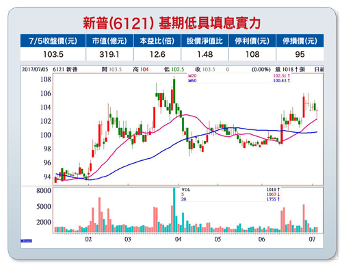 下半年i8拉貨旺季 新普配息六元估可填息新普(6121)過去六年來,每年EPS為九至十二元,獲利可說相當穩定,今年預估配息六元,加上現金減資四元。今年第一季EPS為一.八元,公司預估第二季每股獲利為一.七四至一.八六元,下半年蘋果iPhone 8拉貨旺季到,預估全年EPS應該仍有八至九元的實力。七月十三日除息六元,波段應有填息實力。