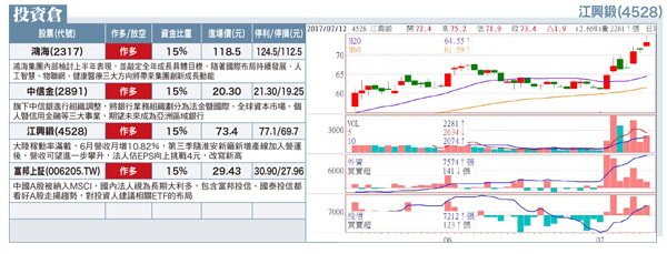 鴻海(2317):集團目前力拚創新成長,目標在人工智慧(AI)、物聯網、健康醫療三路並進。集團總裁郭台銘日前指出,將擴大在台灣的健康財相關投資,力助台灣醫生與醫療提高價值,另積極新創創新投資,擬參與美國矽谷AI投資聯盟。據了解,鴻海集團內部檢討上半年表現,並敲定全年成長具體目標,其中隨著集團國際布局持續發展,人工智慧、物聯網、健康醫療三大方向將帶來集團創新成長動能。中信金(2891):旗下中信銀進行組織調整案,將銀行業務組織劃分為法金暨國際、全球資本市場、個人暨信用金融等三大事業。總經理吳一揆表示,隨著海外平台建構愈趨完整,期望未來可有效掌握亞太區域成長機會,使旗下中信銀能成為亞洲區域銀行。江興鍛(4528):目前大陸稼動率滿載,預估6月營收可望維持高檔,第三季隨淮安新廠新增產線加入營運後,屆時營收可望進一步攀升,第三季單季營收也可望挑戰新高紀錄,法人估,今年全年營收年增一成,每股盈餘向上挑戰4元,改寫新高。富邦上証(006205.TW):中國A股被納入MSCI,被國內法人視為長期大利多,包含富邦投信、國泰投信都看好A股走揚趨勢,對投資人建議相關ETF的布局,雖市場擔心錢會外流,但此時應對方法之一,無疑是用具有進口替代效果的的ETF來面對,證交所也指出,實際上相較複委託交易,ETF更能減輕投資成本。