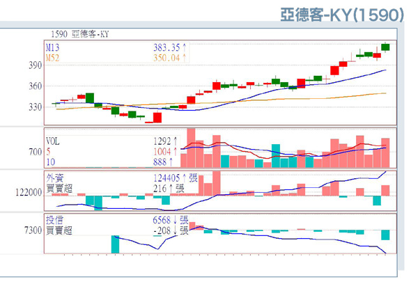 亞德客-KY(1590)六月合併營收不論人民幣或新台幣計價均創單月新高,第二季合併營收締造單季新高。法人預估,亞德客第二季EPS高達五元以上,上半年EPS至少八.五至九元,全年營收人民幣上看二十八億元、EPS具有挑戰十五元的實力。展望第三季,有鑑於目前訂單熱度仍高,法人認為,亞德客-KY七月合併營收仍可維持相對高檔。鴻海(2317)集團目前力拚創新成長,目標在人工智慧(AI)、物聯網、健康醫療三路並進。集團總裁郭台銘日前指出,將擴大在台灣的健康財相關投資,力助台灣醫生與醫療提高價值,另積極新創創新投資,擬參與美國矽谷AI投資聯盟。據了解,鴻海集團內部檢討上半年表現,並敲定全年成長具體目標,其中隨著集團國際布局持續發展,人工智慧、物聯網、健康醫療三大方向將帶來集團創新成長動能。江興鍛(4528)目前大陸稼動率滿載,預估六月營收可望維持高檔,第三季隨淮安新廠新增產線加入營運後,屆時營收可望進一步攀升,第三季單季營收也可望挑戰新高紀錄,法人估,今年全年營收年增一成,每股盈餘向上挑戰四元,改寫新高。群益期(6024)受惠於股市上萬點,市場波動放大,獲利持續維持高檔水準,六月每股稅前盈餘○.五六元,今年一至六月累計每股稅前盈餘二.三五元。期交所在五月推出盤後交易,目前夜盤成交量占日盤交易比例約七%,可見潛力十足,今年市場成交量成長可期期。