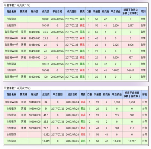 七月二十五日,當指數回測,關鍵次箱一○三三九,出現止跌訊號,買進多單,隨即往上走,收盤前仍收在ma1次箱底上,且判斷波動尚未走完,留倉。(若有人問,留倉萬一次日跌破,怎辦?投資必定有風險,這是個好答案,是一種抉擇,是如何判斷,我看到關鍵次箱處出現止跌缺口。) 七月二十六日,開盤跳空開高,但不過次箱頂一○三八三,多空交戰,隨即停利一口在一○三八○。突破一○三八三後,就是噴出,最高一○四二一,過日線上漲次箱頂一○四一九,隨即壓回,關注一○四○三次箱底,打到一○四○三又往上攻,但又不過一○四一九,另一口多單即停利在一○四一六。繼續觀察攻防交戰,過不了一○四一九,空一口,當然要作被突破停損的準備,但空下去後,多方確有抵抗,但最高一○四一七,仍過不了一○四一九,形成止漲缺口,隨即下殺,驗證空下去,就是要破,破了就抱,目標看支撐一○三三九,在阻斷ma1次箱後,回補於一○三五二。(瞬間打到一○三三○收腳,後來盤整又破箱底,但已過十點半就休息了。) 以兩日的進出點位,買多在相對低,賣在相對高;又賣空在相對高,補在相對低點,若不是箱波均提前規劃出,盤中必然出現遲疑,是無法順應速度盤的。今天能將所學發揮出來,感謝老師,自己也要繼續精進,複製成功經驗,再熟練之。今日大台多一口+三十三點,多一口+六十九點,空一口+六十七點,多空雙向+一九九點。加上OP,總淨利+四一二五三元。