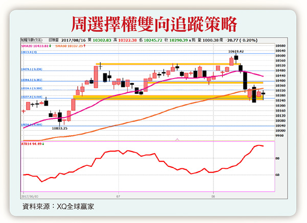 七月份美國零售數據獲○.六%增長,優於市場預期的○.四%,市場重新思考年底聯準會升息可能性。近期市場聚焦企業財報和政治風險,但全球央行年會,將重新拉回到利率、QE等貨幣政策的問題,FED縮表以及ECB何時退出QE,預期將在八月二十四日央行年會提出,全球市場資金年底將會有不同的流向。延續一周的美朝風暴,在輿論臆測被官方聲明打臉後,全球股市也止跌回穩,在這一輪修正中,外資順勢出了不少,上周賣超台股一百五十多億,台積電(2330)與鴻海(2317),外資七月賣出多過買進,八月十一日台股自低點反彈時,外資賣超台積電二萬四千多張,賣超鴻海九千八百多張,即便現在台股止穩,也沒有明顯逢低承接的意願,顯示外資對台股態度還是偏向保守。加權指數自一○六一九轉折向下修正之後,目前指數在一○二五○上方震盪整理,從黃金切割來看,此處位於○.六一八的滿足區,也構成六、七、八月夏季走勢的M型頭部,形成頸線支撐。接著看籌碼,八月十一日外資在期貨未平倉淨多單三萬四千多口,仍是在四萬口下來回進出,態度就是沒打算要積極買進但也不大賣。自營商在選擇權未平倉部位,還是Sell Call和Sell Put,但口數已呈現Sell Call遠小於Sell Put布局,代表內資預期短線反彈機會升高,因此大幅回補Sell Call部位,整體呈現中性偏空趨勢。配合ATR觀察,近期指數波動放大,加上台股現在面臨重要區域防守,可利用突破(買方跨式或勒式)策略做布局。