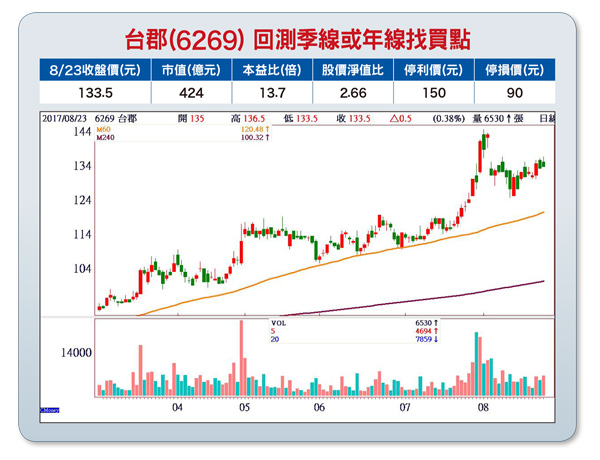 台郡下半年營運展望佳 不追高 回測均線分批買台郡(6269)上半年每股賺二.○四元,受惠於蘋果新機強勁的備貨需求,且台郡又搶下電源管理模組、面板光電控制模組、光學與無線傳輸模組等新領域應用軟板,讓台郡對下半年營運感到相當樂觀。台郡財務長熊雅士表示,今年第三季和第四季將回歸到以手機為主力的戰場,以生產與備貨的數量來看,預估第三季將較去(二○一六)年同期兩位數成長,如果以金額來看的話,年成長幅度則會更大,而今年第四季又會比第三季好。而且今年單月最高營收將超過三十億元,超過去年單月營收最高點的二四.五三億元。此外,為了配合軟板業五年一波的新技術發展,台郡從今年起將啟動未來三年六十億元的土地/廠房/新技術設備的投資,這項投資案將能再造台郡未來五年的多角化成長。所謂軟板新技術的發展,包括手機高階細線路軟板、二十到二十五micro以下線路製程、AMOLED與Micro LED用軟板,以及高速和無線傳輸用軟板等。在操作建議上,因為蘋概股普遍早已事先反映iPhone 8出貨利多,所以當九月公布八月營收成績以及新機發表會前後,須提防短期利多出盡做一波拉回整理。因此,原則上我們建議短期不必過度追價做多,待回測季線甚至年線時,再分批進場承接。
